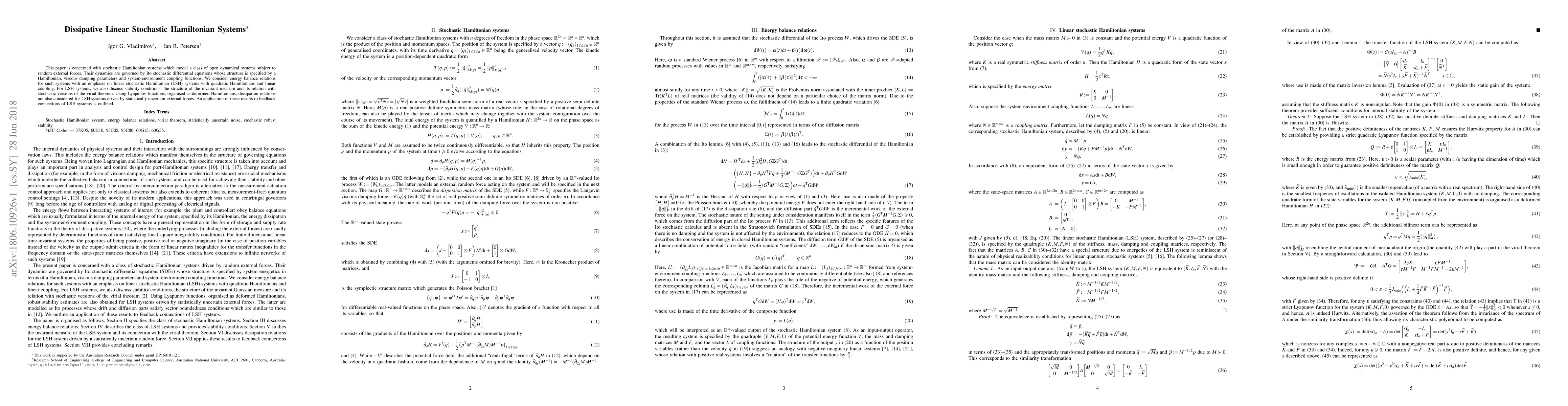 This paper explores stochastic Hamiltonian systems, focusing on linear stochastic Hamiltonian (LSH) systems with quadratic Hamiltonians and linear coupling, analyzing their stability, invariant measures, and energy balance. It also discusses dissipation relations using deformed Hamiltonians and Lyapunov functions, with an application to feedback connections.