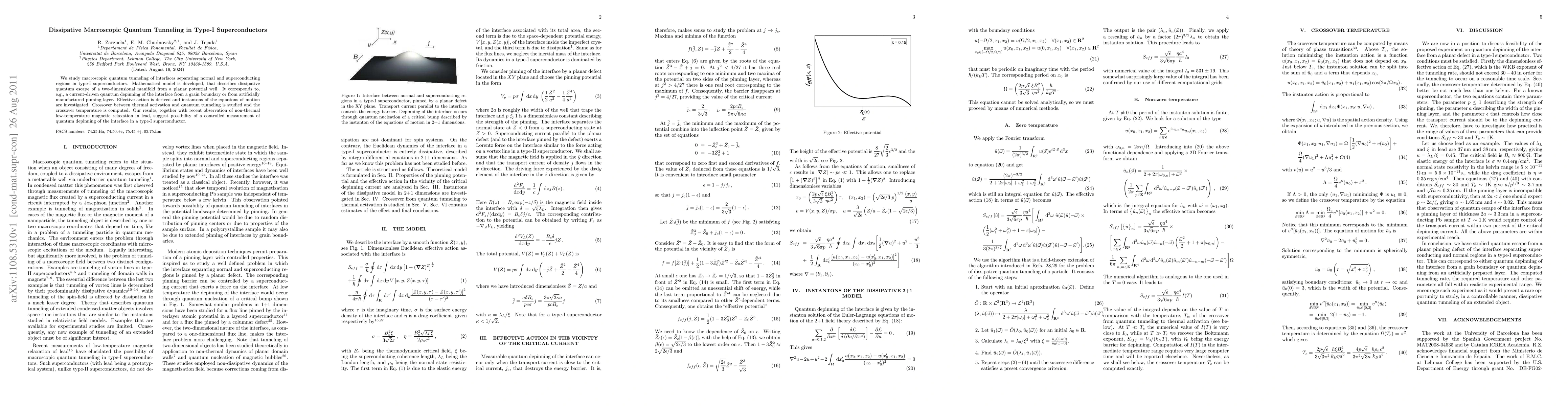 This paper develops a mathematical model to describe dissipative macroscopic quantum tunneling in type-I superconductors, focusing on interfaces separating normal and superconducting regions. It investigates the crossover between thermal activation and quantum tunneling, suggesting potential for controlled measurement of quantum depinning in these superconductors.