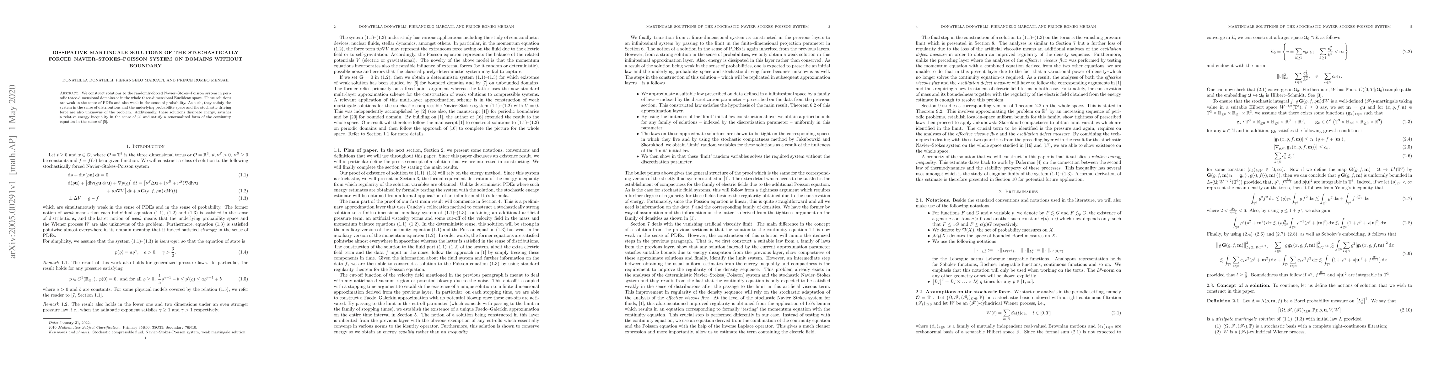 Researchers develop solutions to a complex mathematical system that combines Navier-Stokes equations with Poisson's law, driven by random forces in periodic or 3D domains. These solutions dissipate energy and satisfy key equations, offering insight into the behavior of stochastic fluid dynamics.
