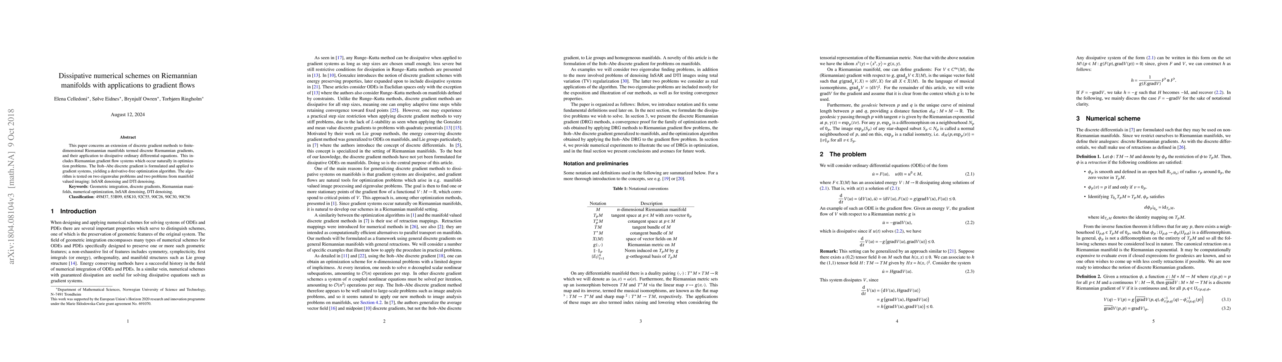 This paper concerns an extension of discrete gradient methods to finite-dimensional Riemannian manifolds termed discrete Riemannian gradients, and their application to dissipative ordinary differential equations. This includes Riemannian gradient flow systems which occur naturally in optimization problems. The Itoh--Abe discrete gradient is formulated and applied to gradient systems, yielding a derivative-free optimization algorithm. The algorithm is tested on two eigenvalue problems and two problems from manifold valued imaging: InSAR denoising and DTI denoising.