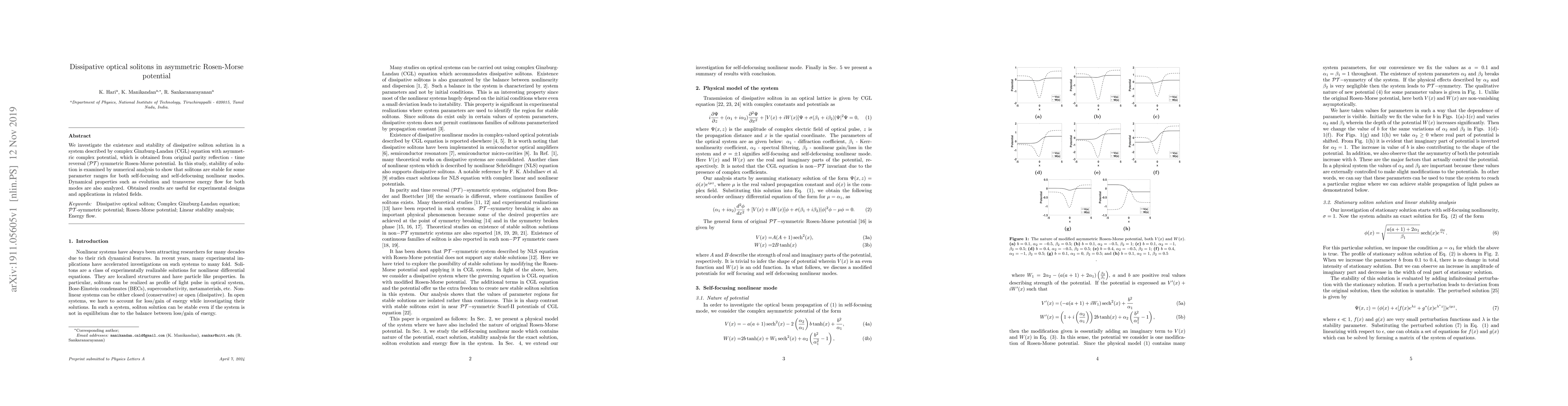 This paper explores dissipative soliton solutions in a complex Ginzburg-Landau equation with an asymmetric Rosen-Morse potential derived from $\mathcal{PT}$ symmetric theory. Numerical analysis reveals stability for certain parameter ranges in both self-focusing and self-defocusing modes, with implications for experimental designs and applications.