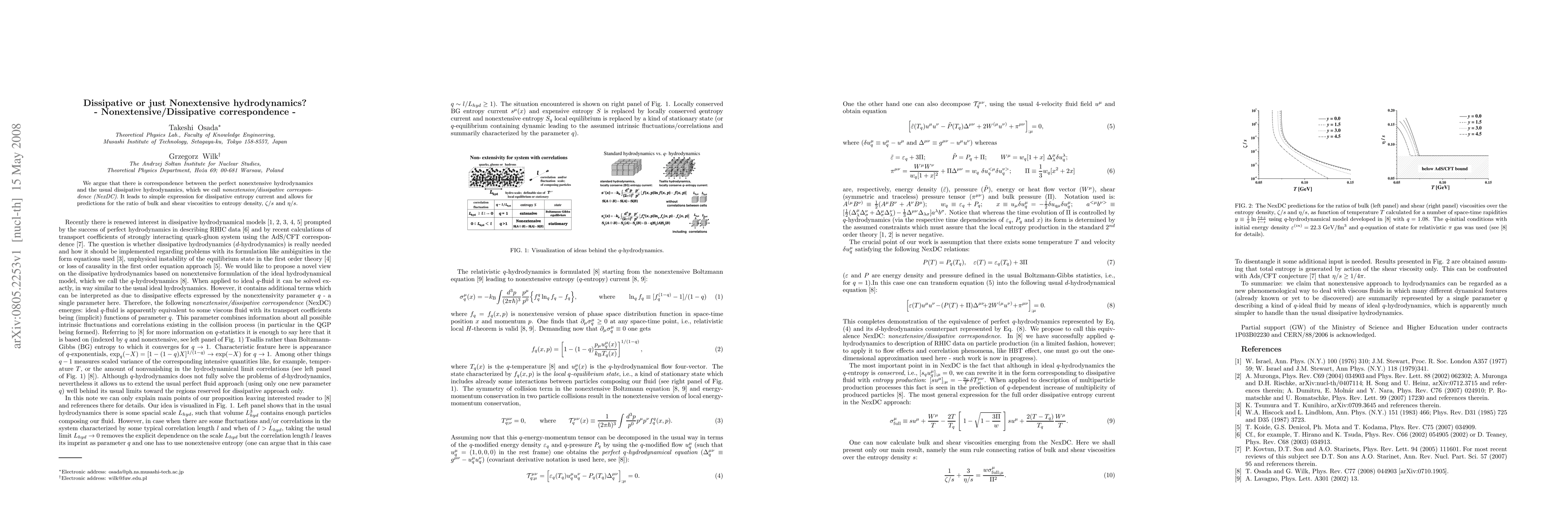 Title: Dissipative or just Nonextensive hydrodynamics? Abstract: This paper establishes a correspondence between perfect nonextensive hydrodynamics and conventional dissipative hydrodynamics, termed NexDC, which simplifies the expression for dissipative entropy current and predicts the ratios $\zeta/s$ and $\eta/s$ of bulk and shear viscosities to entropy density.