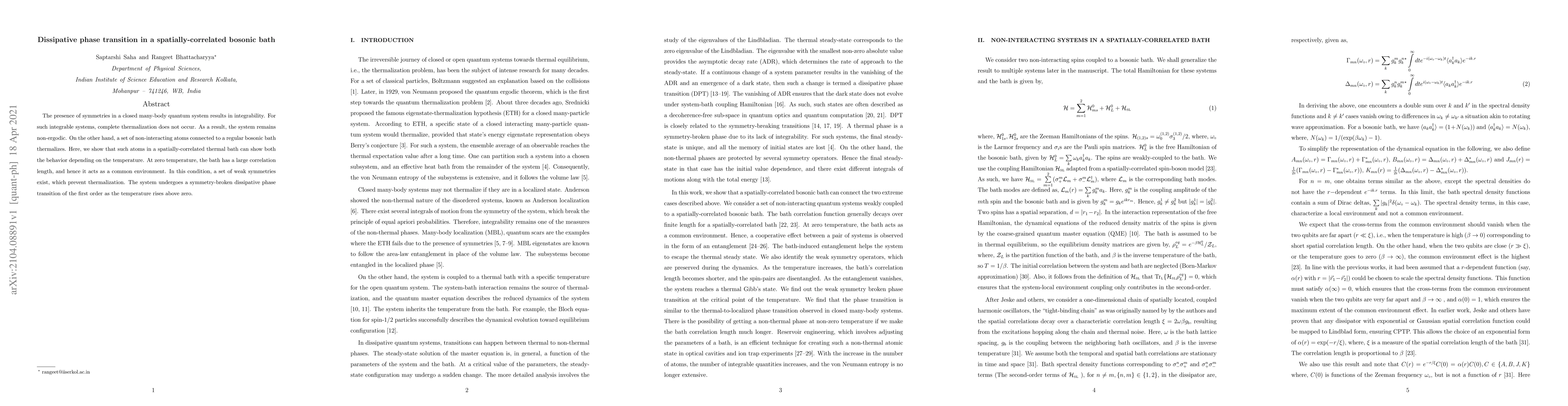 The presence of symmetries in a closed many-body quantum system results in integrability. For such integrable systems, complete thermalization does not occur. As a result, the system remains non-ergodic. On the other hand, a set of non-interacting atoms connected to a regular bosonic bath thermalizes. Here, we show that such atoms in a spatially-correlated thermal bath can show both the behavior depending on the temperature. At zero temperature, the bath has a large correlation length, and hence it acts as a common environment. In this condition, a set of weak symmetries exist, which prevent thermalization. The system undergoes a symmetry-broken dissipative phase transition of the first order as the temperature rises above zero.