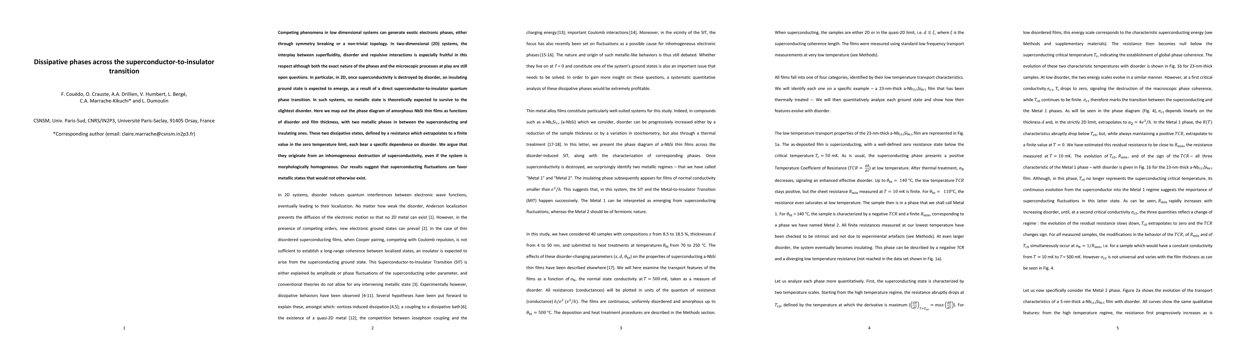This paper investigates the existence of dissipative metallic phases in amorphous NbSi thin films during the superconductor-to-insulator transition, revealing two metallic phases with distinct disorder dependencies. The findings suggest that the destruction of superconductivity can lead to metallic states through inhomogeneous processes, despite the system's morphological homogeneity.