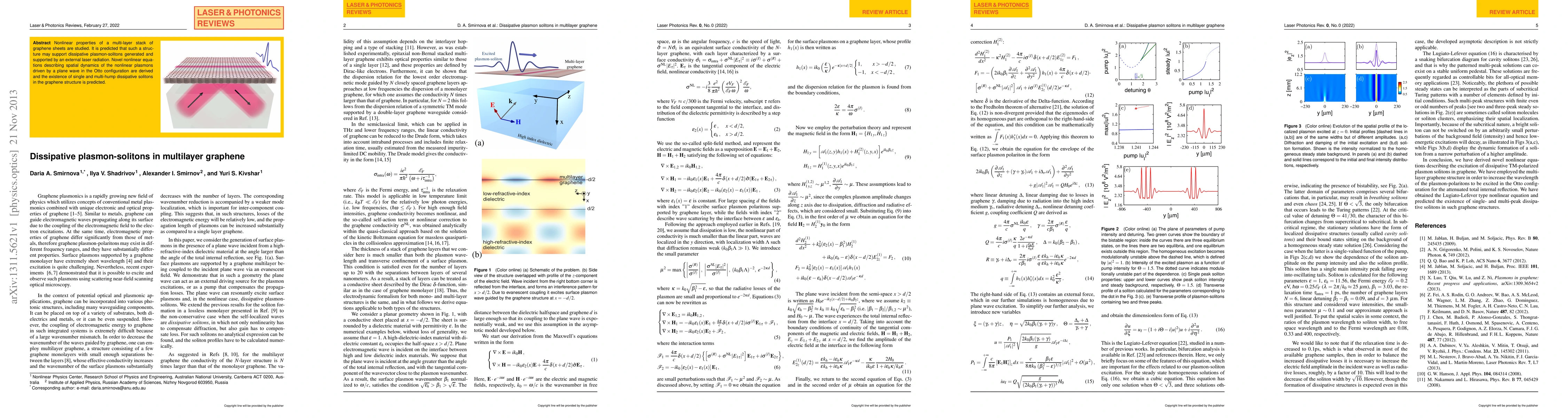 This research investigates the nonlinear properties of multilayer graphene, predicting the support of dissipative plasmon-solitons generated by external laser radiation. Novel equations describe the spatial dynamics of these nonlinear plasmons, predicting the existence of single and multi-hump solitons within the structure.