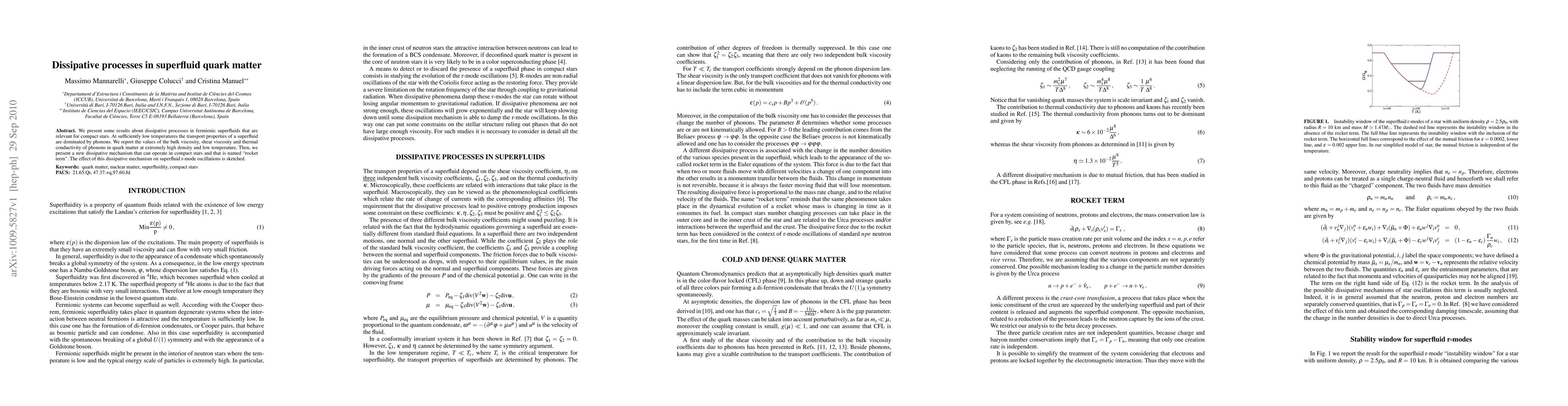 We present some results about dissipative processes in fermionic superfluids that are relevant for compact stars. At sufficiently low temperatures the transport properties of a superfluid are dominated by phonons. We report the values of the bulk viscosity, shear viscosity and thermal conductivity of phonons in quark matter at extremely high density and low temperature. Then, we present a new dissipative mechanism that can operate in compact stars and that is named "rocket term". The effect of this dissipative mechanism on superfluid r-mode oscillations is sketched.