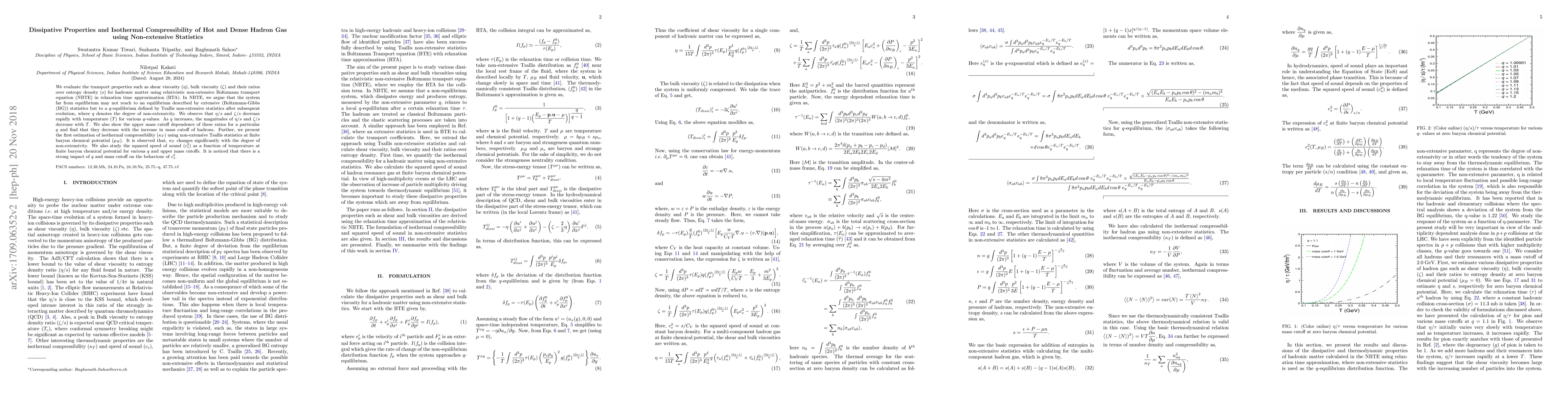 This paper evaluates the transport properties of a hot and dense hadron gas using relativistic non-extensive Boltzmann transport equation, finding that shear and bulk viscosities decrease with temperature and non-extensivity degree. It also estimates isothermal compressibility and speed of sound, showing significant dependence on non-extensivity and mass cutoff.