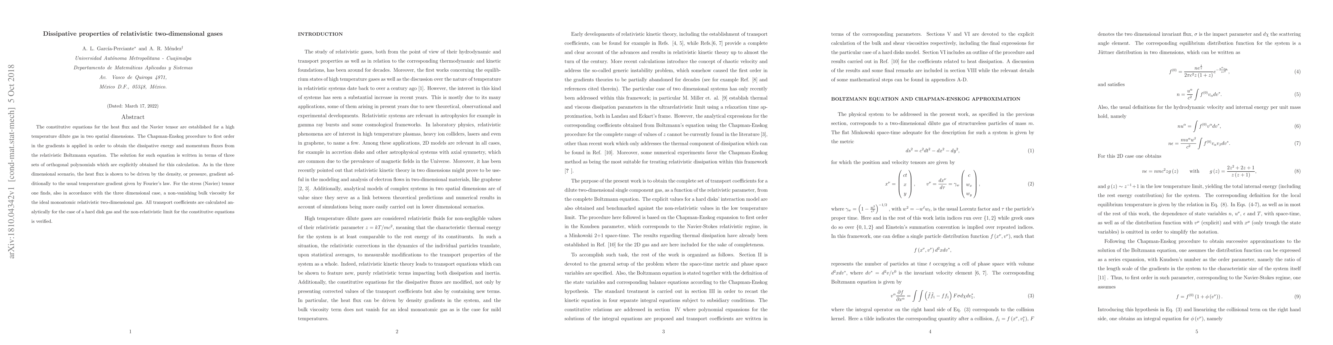 This paper establishes constitutive equations for heat flux and the Navier tensor in relativistic two-dimensional gases, applying the Chapman-Enskog method to derive dissipative fluxes from the relativistic Boltzmann equation. It finds that heat flux and stress tensors exhibit behavior analogous to three-dimensional gases, including bulk viscosity.