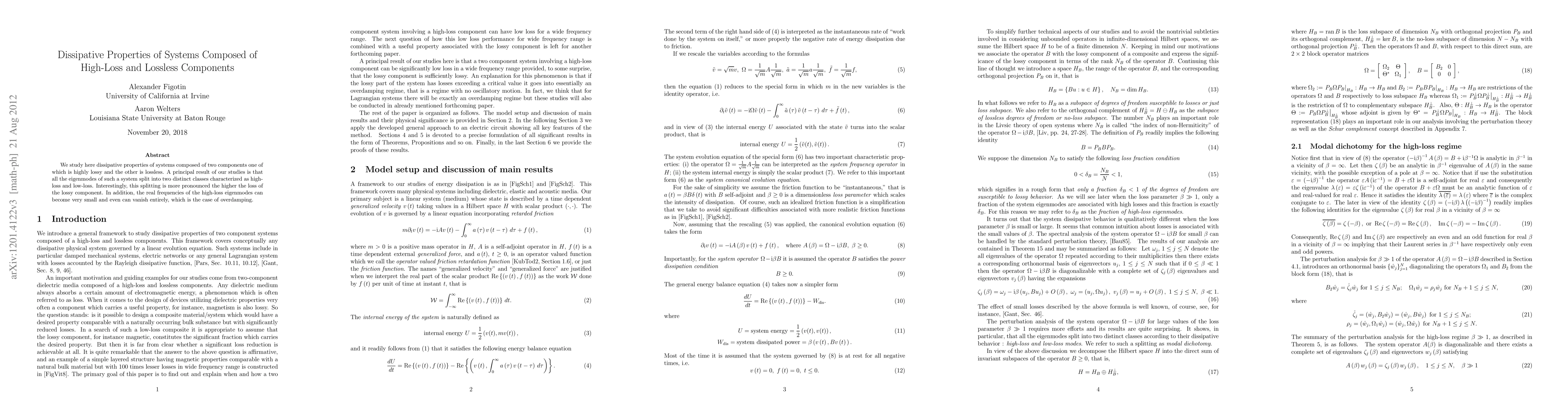 We study here dissipative properties of systems composed of two components one of which is highly lossy and the other is lossless. A principal result of our studies is that all the eigenmodes of such a system split into two distinct classes characterized as high-loss and low-loss. Interestingly, this splitting is more pronounced the higher the loss of the lossy component. In addition, the real frequencies of the high-loss eigenmodes can become very small and even can vanish entirely, which is the case of overdamping.