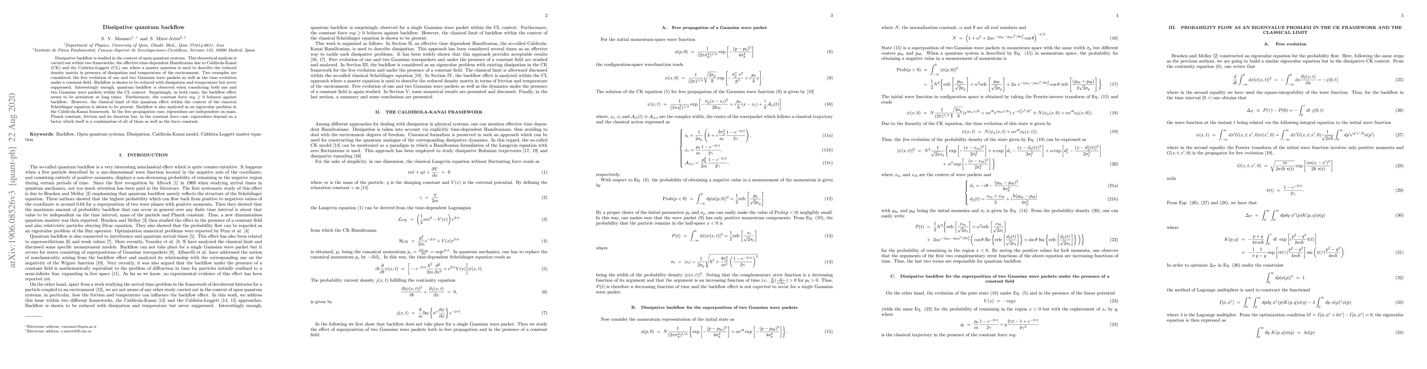 Dissipative backflow is studied in the context of open quantum systems. This theoretical analysis is carried out within two frameworks, the effective time-dependent Hamiltonian due to Caldirola-Kanai (CK) and the Caldeira-Leggett (CL) one where a master equation is used to describe the reduced density matrix in presence of dissipation and temperature of the environment. Two examples are considered, the free evolution of one and two Gaussian wave packets as well as the time evolution under a constant field. Backflow is shown to be reduced with dissipation and temperature but never suppressed. Interestingly enough, quantum backflow is observed when considering both one and two Gaussian wave packets within the CL context. Surprisingly, in both cases, the backflow effect seems to be persistent at long times. Furthermore, the constant force $ m g\geq 0 $ behaves against backflow. However, the classical limit of this quantum effect within the context of the classical Schr\"odinger equation is shown to be present. Backflow is also analyzed as an eigenvalue problem in the Caldirola-Kanai framework. In the free propagation case, eigenvalues are independent on mass, Planck constant, friction and its duration but, in the constant force case, eigenvalues depend on a factor which itself is a combination of all of them as well as the force constant.