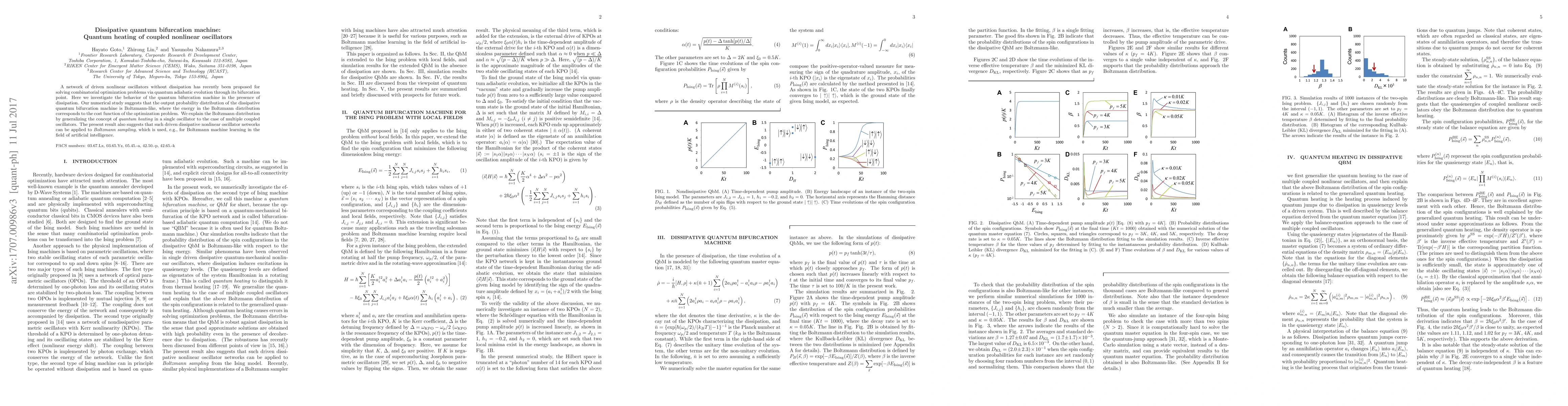 This paper explores the behavior of a quantum bifurcation machine with dissipation, showing that it produces a Boltzmann-like output probability distribution. The study generalizes quantum heating to coupled nonlinear oscillators, suggesting potential applications in Boltzmann sampling and artificial intelligence.
