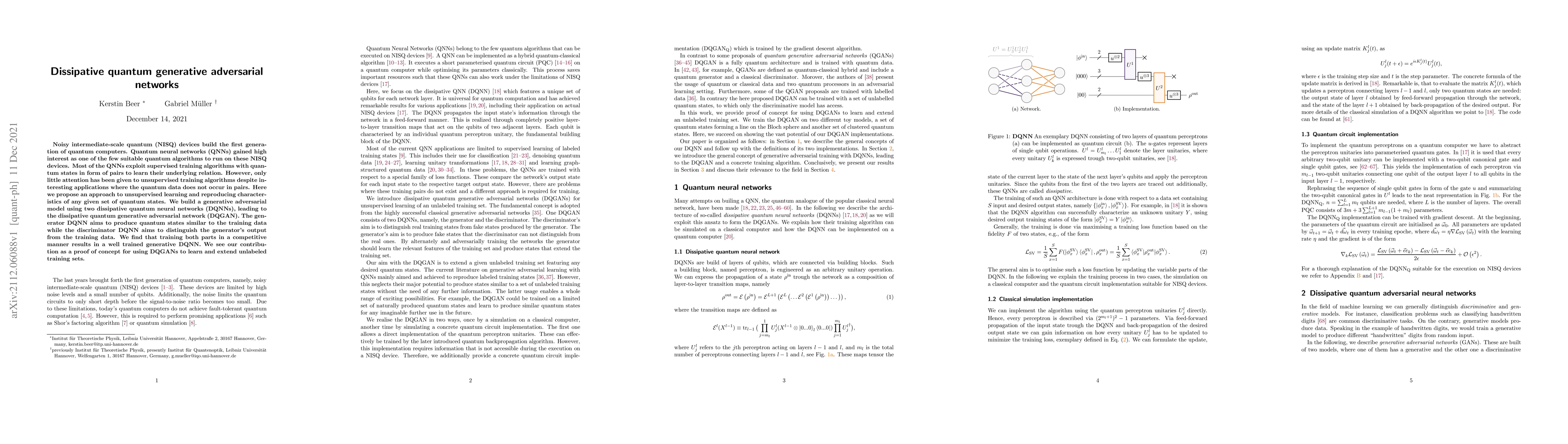 Noisy intermediate-scale quantum (NISQ) devices build the first generation of quantum computers. Quantum neural networks (QNNs) gained high interest as one of the few suitable quantum algorithms to run on these NISQ devices. Most of the QNNs exploit supervised training algorithms with quantum states in form of pairs to learn their underlying relation. However, only little attention has been given to unsupervised training algorithms despite interesting applications where the quantum data does not occur in pairs. Here we propose an approach to unsupervised learning and reproducing characteristics of any given set of quantum states. We build a generative adversarial model using two dissipative quantum neural networks (DQNNs), leading to the dissipative quantum generative adversarial network (DQGAN). The generator DQNN aims to produce quantum states similar to the training data while the discriminator DQNN aims to distinguish the generator's output from the training data. We find that training both parts in a competitive manner results in a well trained generative DQNN. We see our contribution as a proof of concept for using DQGANs to learn and extend unlabeled training sets.
