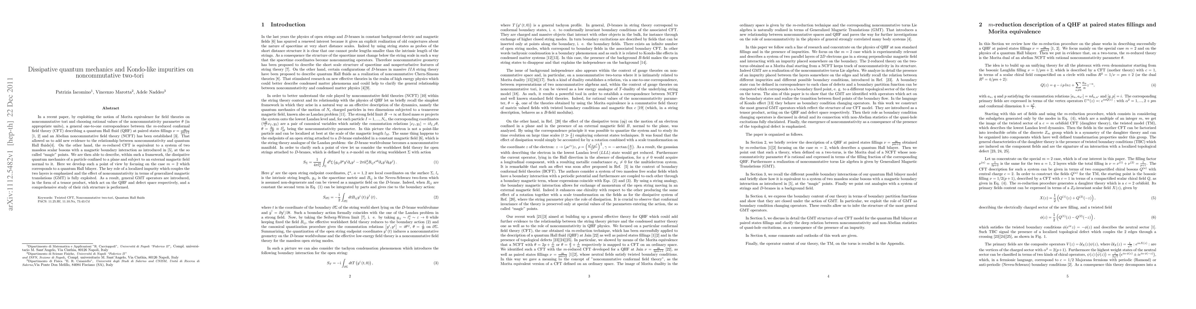 This paper establishes a correspondence between conformal field theories describing quantum Hall fluids and Abelian noncommutative field theories, focusing on the quantum Hall bilayer case. It introduces generalized magnetic translation operators to explore the dissipative quantum mechanics of particles under an external magnetic field, emphasizing the role of Kondo-like impurities on noncommutative two-tori.