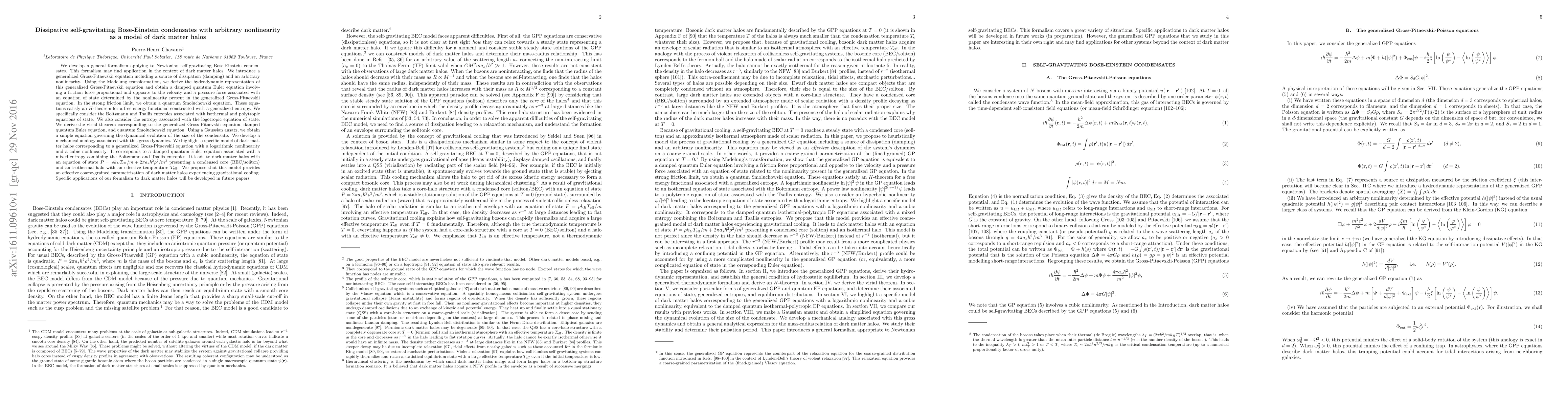 This paper develops a formalism for dissipative self-gravitating Bose-Einstein condensates with arbitrary nonlinearity, proposing a model for dark matter halos. It introduces a generalized Gross-Pitaevskii equation with dissipation and nonlinearity, deriving hydrodynamic equations and a virial theorem, and suggests a logarithmic and cubic nonlinear model for dark matter halos.