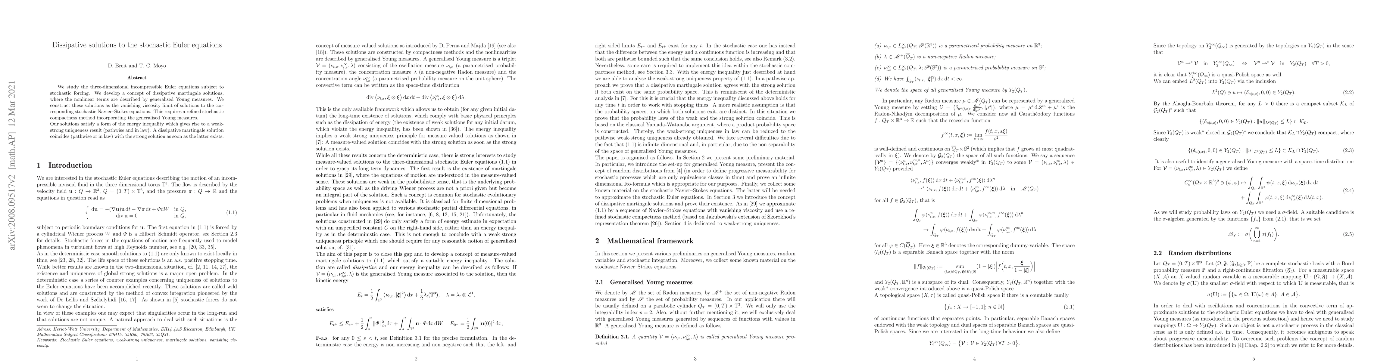 We study the three-dimensional incompressible Euler equations subject to stochastic forcing. We develop a concept of dissipative martingale solutions, where the nonlinear terms are described by generalised Young measures. We construct these solutions as the vanishing viscosity limit of solutions to the corresponding stochastic Navier-Stokes equations. This requires a refined stochastic compactness method incorporating the generalised Young measures. Our solutions satisfy a form of the energy inequality which gives rise to a weak-strong uniqueness result (pathwise and in law). A dissipative martingale solution coincides (pathwise or in law) with the strong solution as soon as the latter exists.
