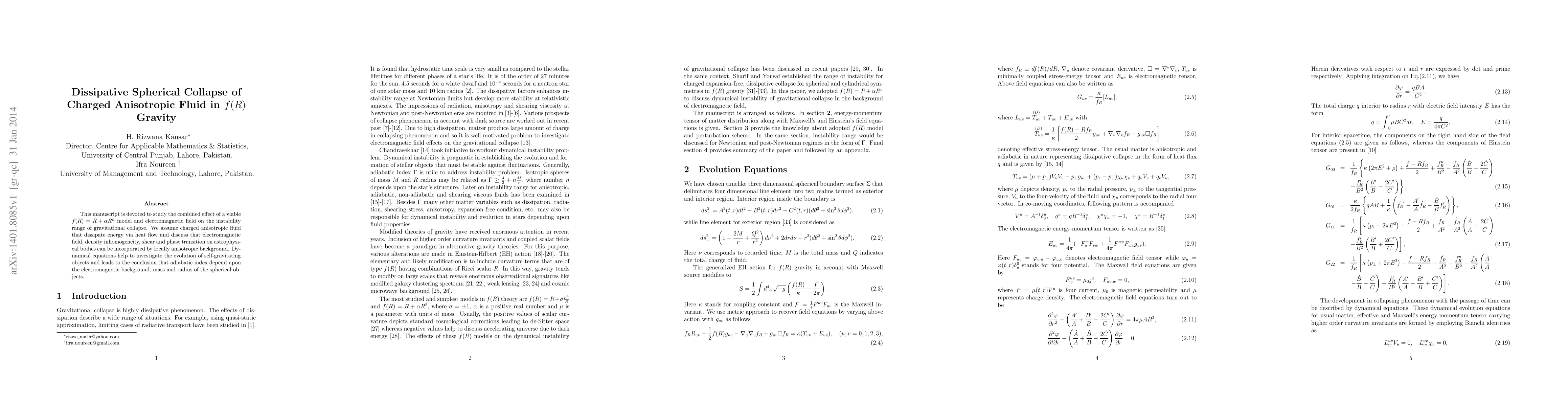 This paper examines the gravitational collapse of charged anisotropic fluid in f(R) gravity, considering a dissipative model with an electromagnetic field. It concludes that the adiabatic index of the collapsing object is influenced by the electromagnetic background, mass, and radius.