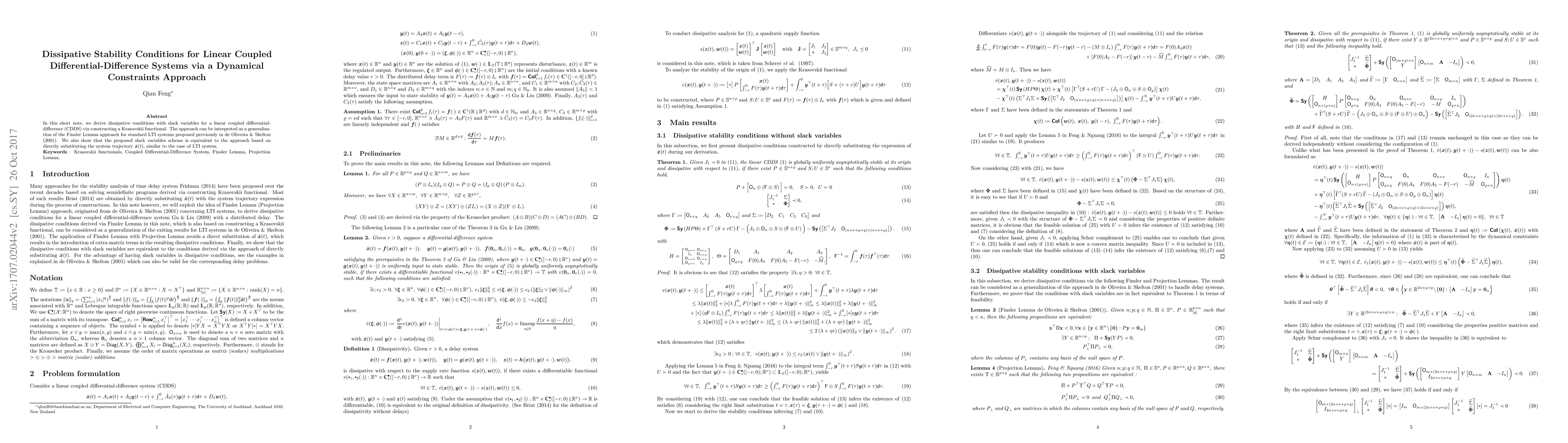 This paper derives dissipative stability conditions for linear coupled differential-difference systems using a dynamical constraints approach and a Krasovskii functional. The method generalizes the Finsler Lemma approach for standard linear time-invariant systems and introduces a scheme with slack variables equivalent to direct system trajectory substitution.