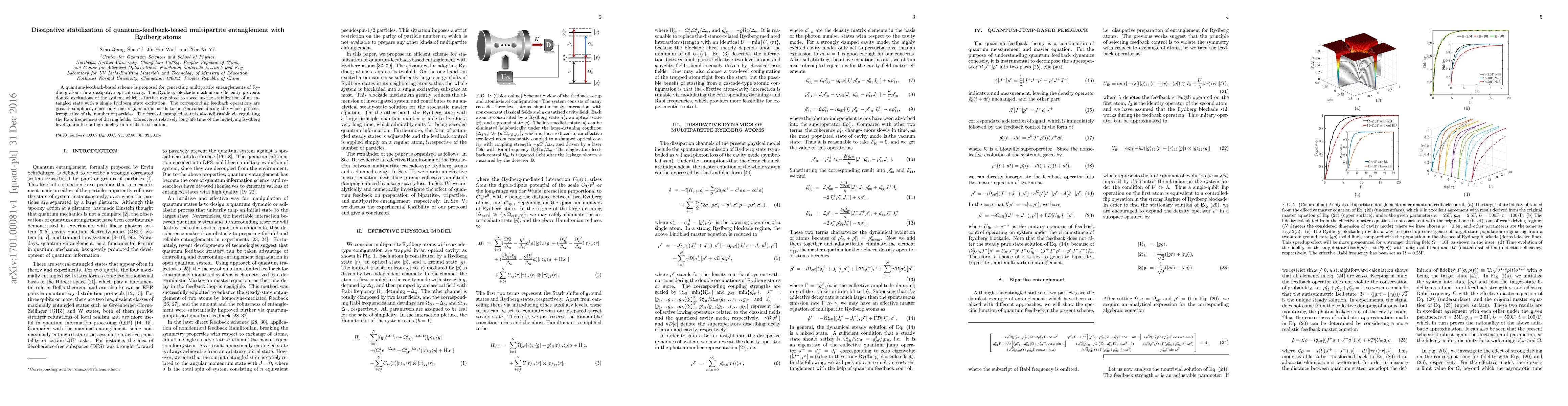 This paper proposes a quantum-feedback scheme to stabilize multipartite entanglement among Rydberg atoms in a dissipative optical cavity, leveraging Rydberg blockade to prevent double excitations and simplify feedback operations. The entangled state's form can be adjusted by regulating driving field frequencies, ensuring high fidelity due to the long lifetime of Rydberg states.