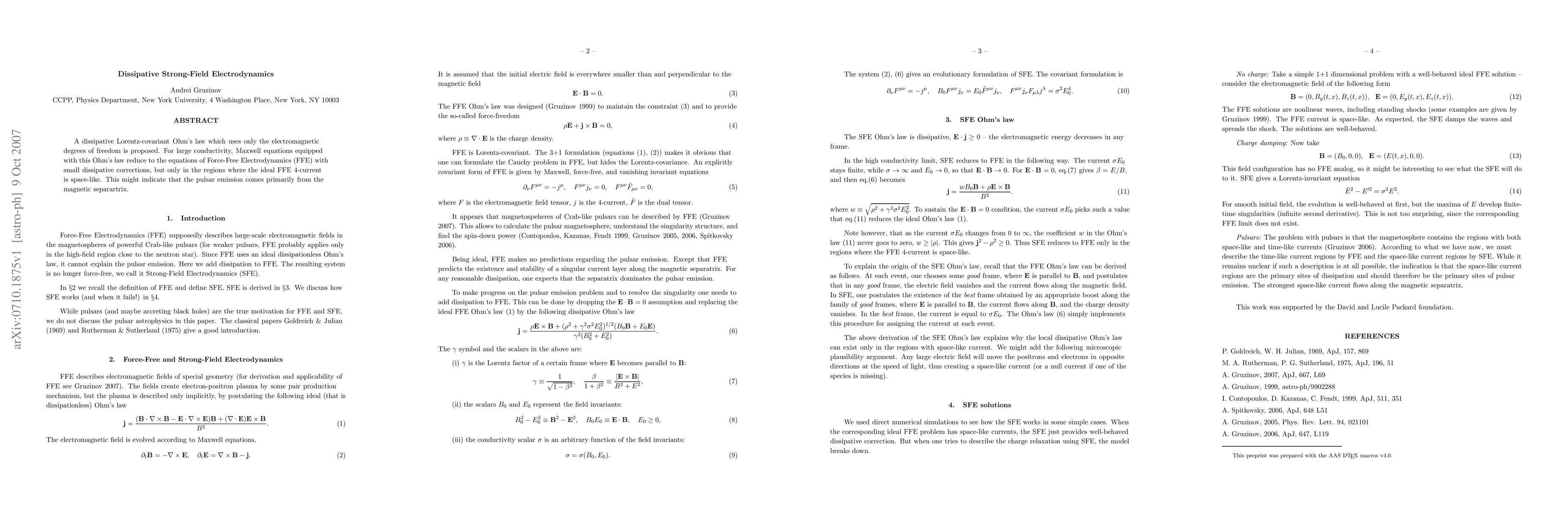 A dissipative Lorentz-covariant Ohm's law which uses only the electromagnetic degrees of freedom is proposed. For large conductivity, Maxwell equations equipped with this Ohm's law reduce to the equations of Force-Free Electrodynamics (FFE) with small dissipative corrections, but only in the regions where the ideal FFE 4-current is space-like. This might indicate that the pulsar emission comes primarily from the magnetic separartrix.