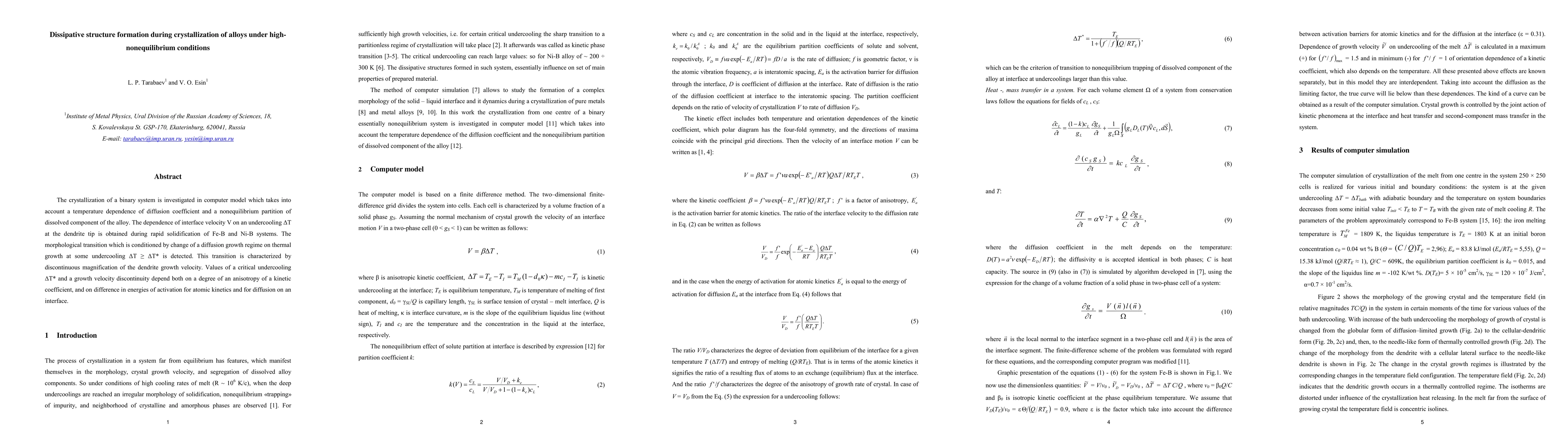 The crystallization of a binary system is investigated in computer model which takes into account a temperature dependence of diffusion coefficient and a nonequilibrium partition of dissolved component of the alloy. The dependence of interface velocity on an undercooling at the dendrite tip is obtained during rapid solidification of Fe-B and Ni-B systems. The morphological transition which is conditioned by change from a diffusion growth regime to thermal growth at some critical undercooling is detected. This transition is characterized by discontinuous magnification of the dendrite growth velocity. Values of a critical undercooling and a growth velocity discontinuity depend both on a degree of an anisotropy of a kinetic coefficient, and on difference in energies of activation for atomic kinetics and for diffusion on an interface.
