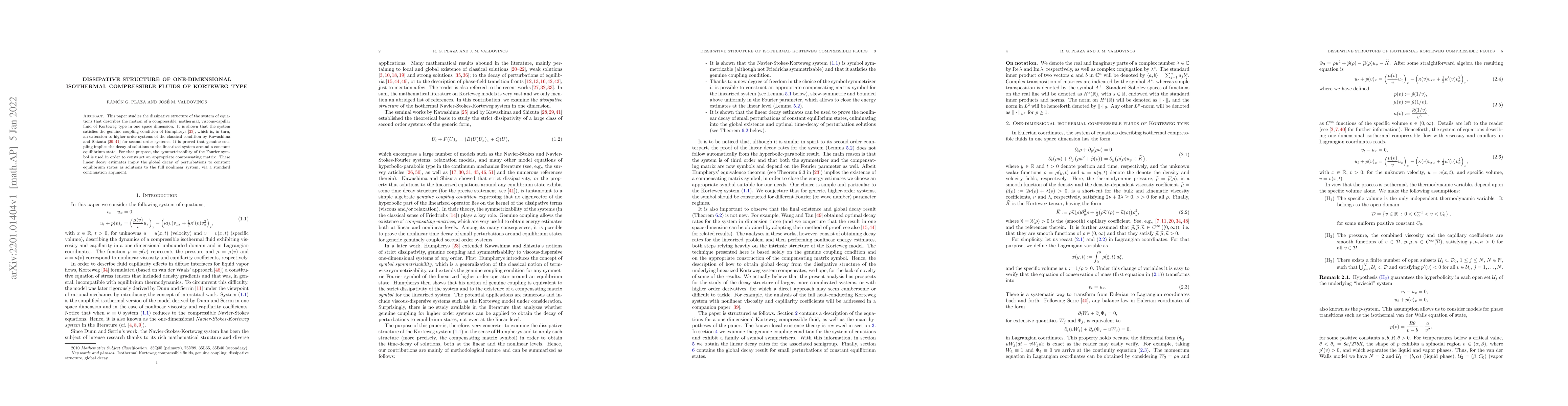 This paper studies the dissipative structure of the system of equations that describes the motion of a compressible, isothermal, viscous-capillar fluid of Korteweg type in one space dimension. It is shown that the system satisfies the genuine coupling condition of Humpherys (J. Hyperbolic Differ. Equ. 2, 2005, no. 4, 963-974), which is, in turn, an extension to higher order systems of the classical condition by Kawashima and Shizuta (Tohoku Math. J. 40, 1988, no. 3, 449-464; Hokkaido Math. J. 14, 1985, no. 2, 249-275) for second order systems. It is proved that genuine coupling implies the decay of solutions to the linearized system around a constant equilibrium state. For that purpose, the symmetrizability of the Fourier symbol is used in order to construct an appropriate compensating matrix. These linear decay estimates imply the global decay of perturbations to constant equilibrium states as solutions to the full nonlinear system, via a standard continuation argument.