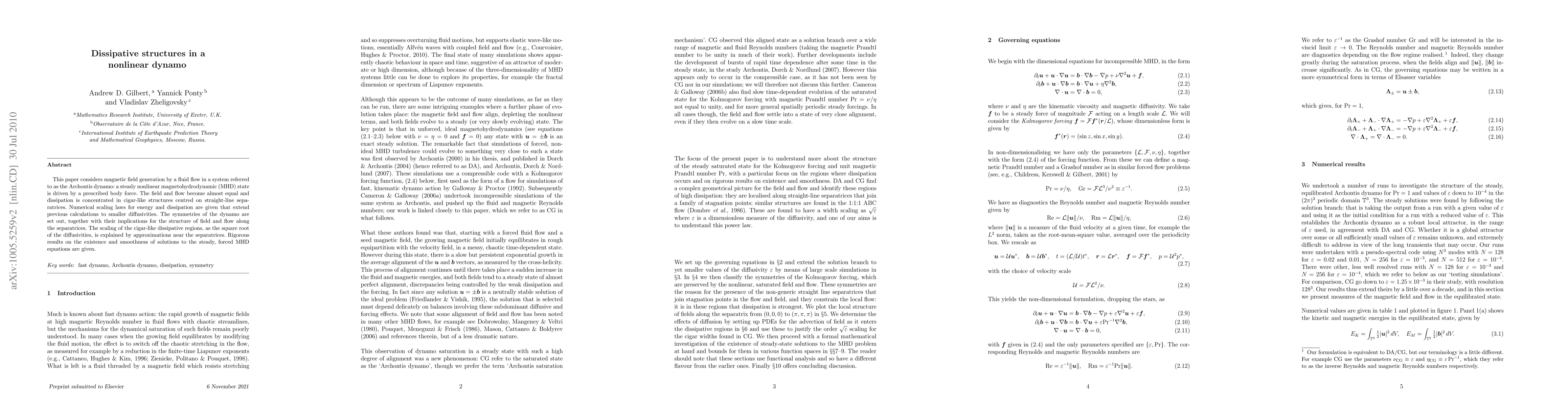 This paper investigates magnetic field generation in the Archontis dynamo, revealing that dissipation concentrates in cigar-like structures along separatrices. Numerical scaling laws extend previous results to smaller diffusivities, highlighting the symmetries and implications for field and flow dynamics.