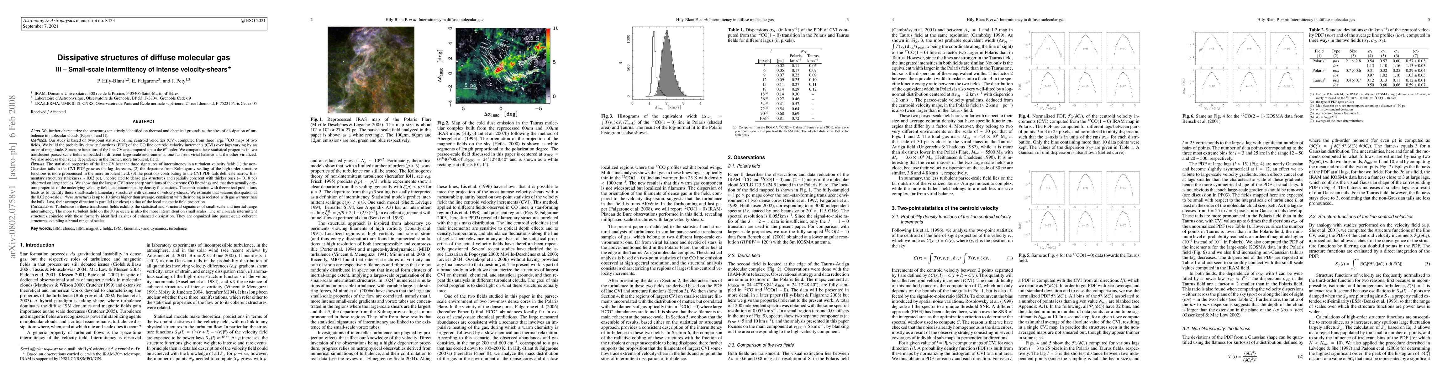 We further characterize the structures tentatively identified on thermal and chemical grounds as the sites of dissipation of turbulence in molecular clouds (Papers I and II). Our study is based on two-point statistics of line centroid velocities (CV), computed from three large 12CO maps of two fields. Probability density functions (PDF) of the CO line centroid velocity increments (CVI) over lags varying by an order of magnitude and structure functions of the line CV, up to the 6th order, are computed. We show that the line CV bear the three signatures of intermittency in a turbulent velocity field: (1) the non-Gaussian tails in the CVI PDF grow as the lag decreases, (2) the departure from Kolmogorov scaling of the high-order structure functions is more pronounced in the more turbulent field, (3) the positions contributing to the CVI PDF tails delineate narrow filamentary structures (thickness ~ 0.02 pc), uncorrelated to dense gas structures and spatially coherent with thicker ones (~0.18 pc) observed on larger scales. The confrontation with theoretical predictions leads us to identify these small-scale filamentary structures with extrema of velocity-shears associated with gas warmer than the bulk. Last, their average direction is parallel (or close) to that of the local magnetic field projection. Turbulence in these translucent fields exhibits the statistical and structural signatures of small-scale and inertial-range intermittency. The more turbulent field on the 30 pc-scale is also the more intermittent on small scales. The small-scale intermittent structures coincide with those formerly identified as sites of enhanced dissipation. They are organized into parsec-scale coherent structures, coupling a broad range of scales.