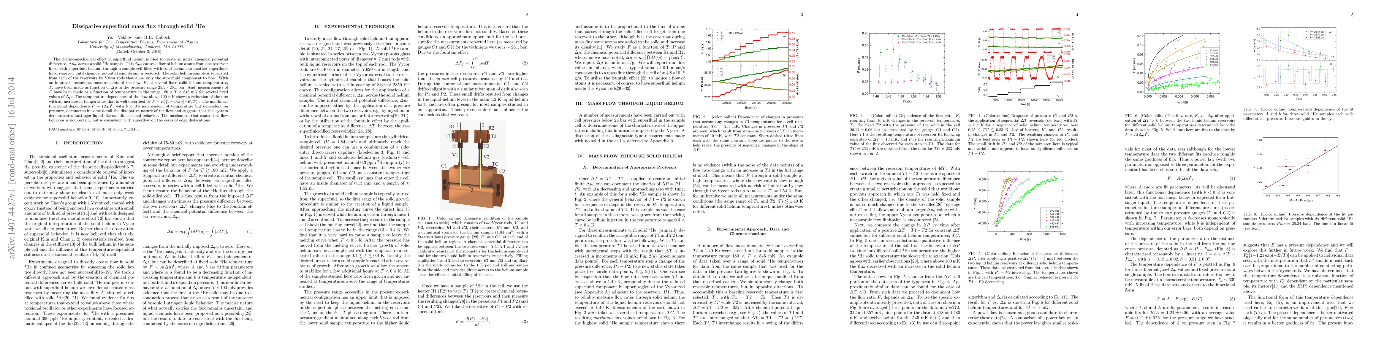 This paper investigates the dissipative superfluid mass flux through solid 4He, demonstrating a thermo-mechanical effect that drives helium atoms through solid helium until chemical potential equilibrium is reached. The study reveals a temperature-dependent reduction in flux and a non-linear dependence on chemical potential, suggesting Luttinger liquid-like behavior and potential superflow along edge dislocations.