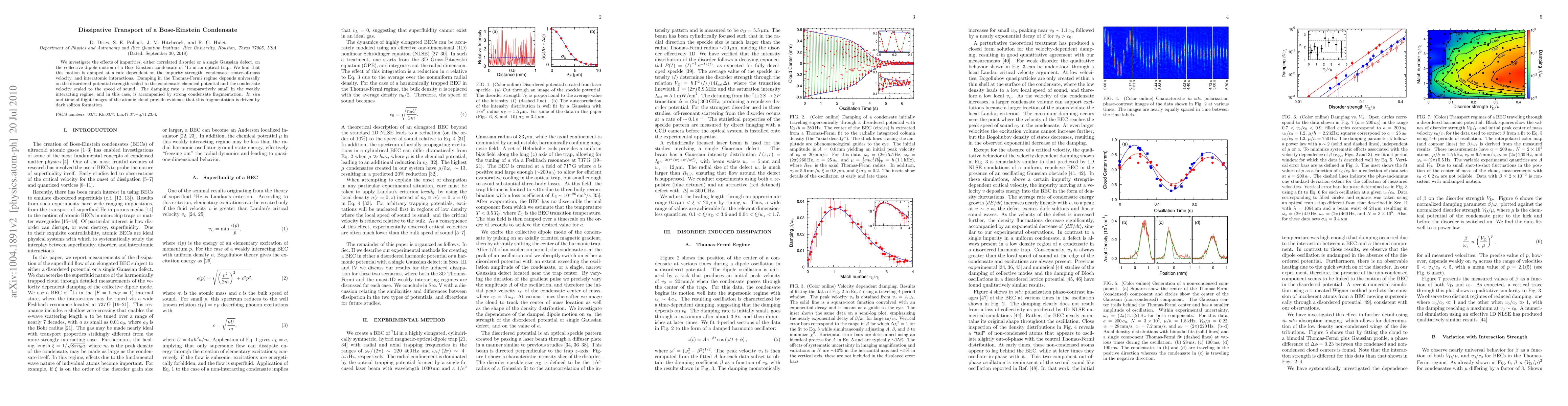 We investigate the effects of impurities, either correlated disorder or a single Gaussian defect, on the collective dipole motion of a Bose-Einstein condensate of $^7$Li in an optical trap. We find that this motion is damped at a rate dependent on the impurity strength, condensate center-of-mass velocity, and interatomic interactions. Damping in the Thomas-Fermi regime depends universally on the disordered potential strength scaled to the condensate chemical potential and the condensate velocity scaled to the peak speed of sound. The damping rate is comparatively small in the weakly interacting regime, and the damping in this case is accompanied by strong condensate fragmentation. \textit{In situ} and time-of-flight images of the atomic cloud provide evidence that this fragmentation is driven by dark soliton formation.