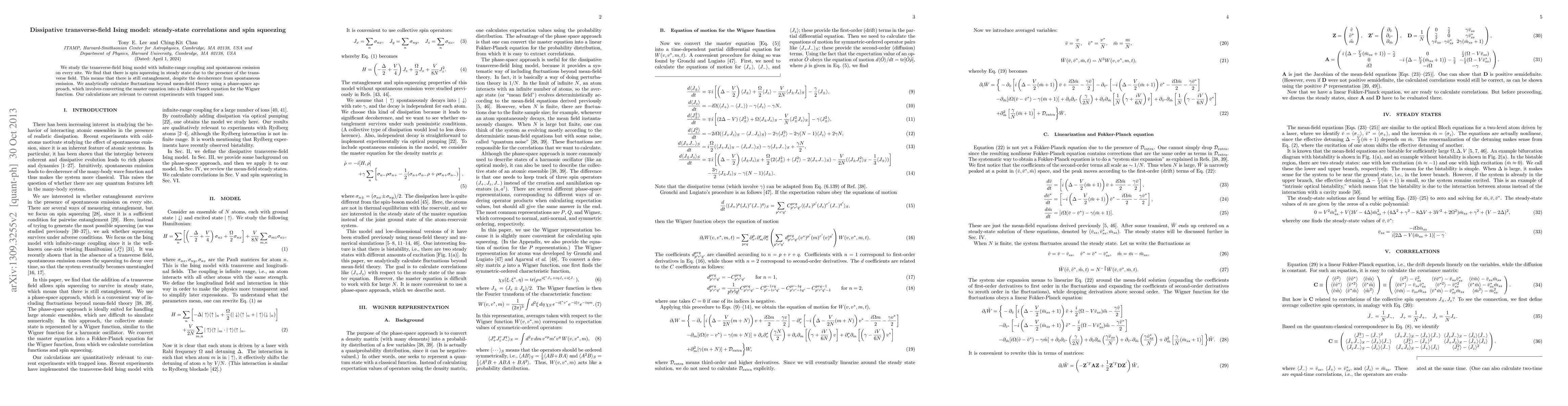 The study investigates the dissipative transverse-field Ising model with infinite-range coupling and spontaneous emission, revealing spin squeezing in steady state due to the transverse field, maintaining entanglement despite decoherence. Analytical calculations using a phase-space approach predict fluctuations beyond mean-field theory, relevant to trapped ion experiments.