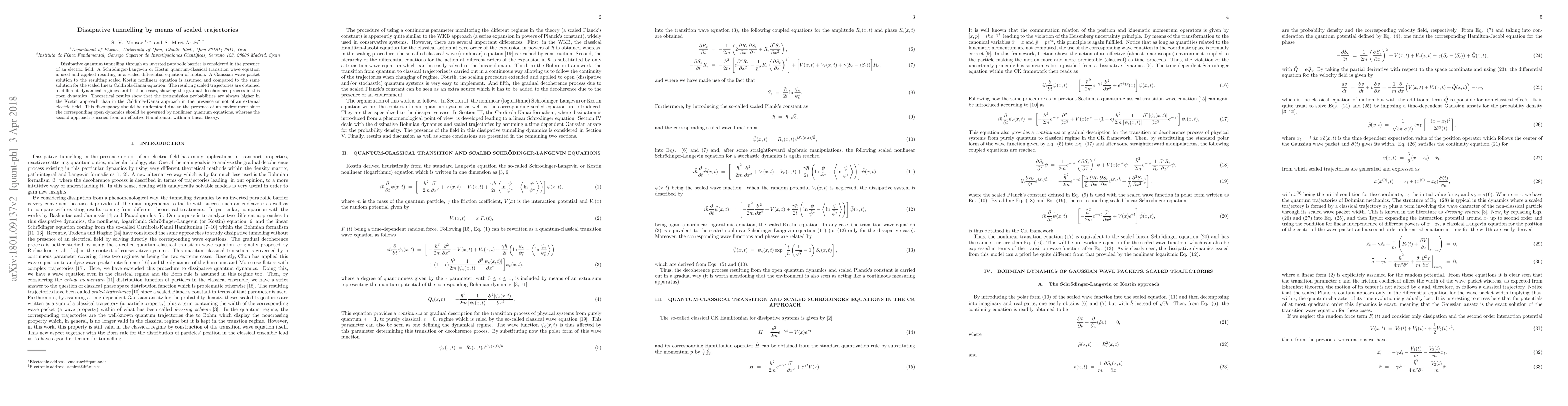 Dissipative quantum tunnelling through an inverted parabolic barrier is considered in the presence of an electric field. A Schr\"odinger-Langevin or Kostin quantum classical transition wave equation is used and applied resulting in a scaled differential equation of motion. A Gaussian wave packet solution to the resulting scaled Kostin nonlinear equation is assumed and compared to the same solution for the scaled linear Caldirola-Kanai equation. The resulting scaled trajectories are obtained at different dynamical regimes and friction cases, showing the gradual decoherence process in this open dynamics. Theoretical results show that the transmission probabilities are always higher in the Kostin approach than in the Caldirola-Kanai approach in the presence or not of an external electric field. This discrepancy should be understood due to the presence of an environment since the corresponding open dynamics should be governed by nonlinear quantum equations, whereas the second approach is issued from an effective Hamiltonian within a linear theory.