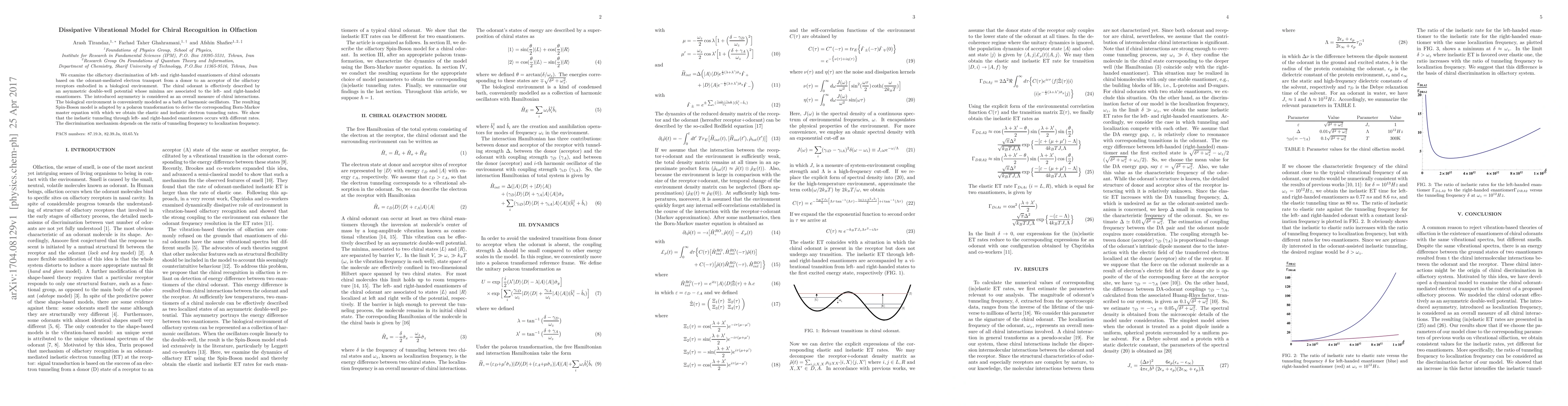 We examine the olfactory discrimination of left- and right-handed enantiomers of chiral odorants based on the odorant-mediated electron transport from a donor to an acceptor of the olfactory receptors embodied in a biological environment. The chiral odorant is effectively described by an asymmetric double-well potential whose minima are associated to the left- and right-handed enantiomers. The introduced asymmetry is considered as an overall measure of chiral interactions. The biological environment is conveniently modeled as a bath of harmonic oscillators. The resulting Spin-Boson model is adapted by a polaron transformation to derive the corresponding Born-Markov master equation with which we obtain the elastic and inelastic electron tunneling rates. We show that the inelastic tunneling through left- and right-handed enantiomers occurs with different rates. The discrimination mechanism depends on the ratio of tunneling frequency to localization frequency.