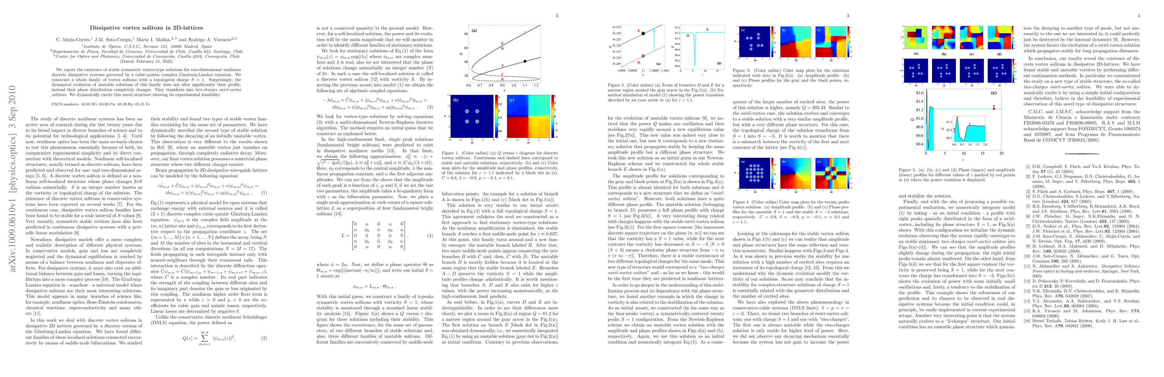 Researchers discovered stable vortex-type solutions in 2D-lattices governed by a complex Ginzburg-Landau equation, which transform into two-charges swirl-vortex solitons under dynamic excitation.