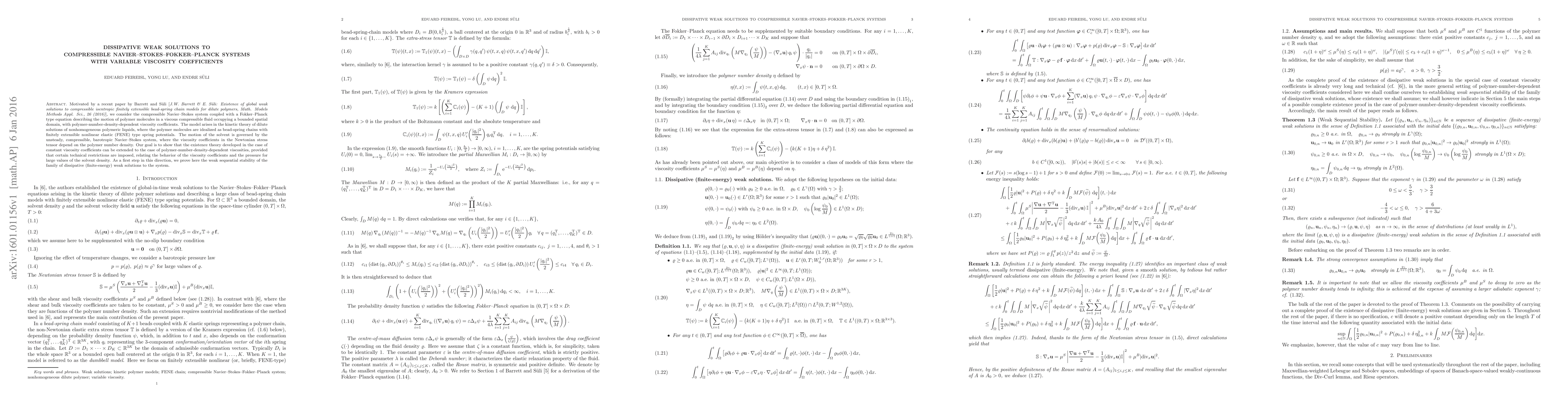 This paper extends the existence theory for compressible Navier-Stokes systems to include variable viscosity coefficients dependent on polymer number density, proving weak sequential stability of dissipative weak solutions. The model combines fluid dynamics with Fokker-Planck equations for polymer molecules in nonhomogeneous polymeric liquids.