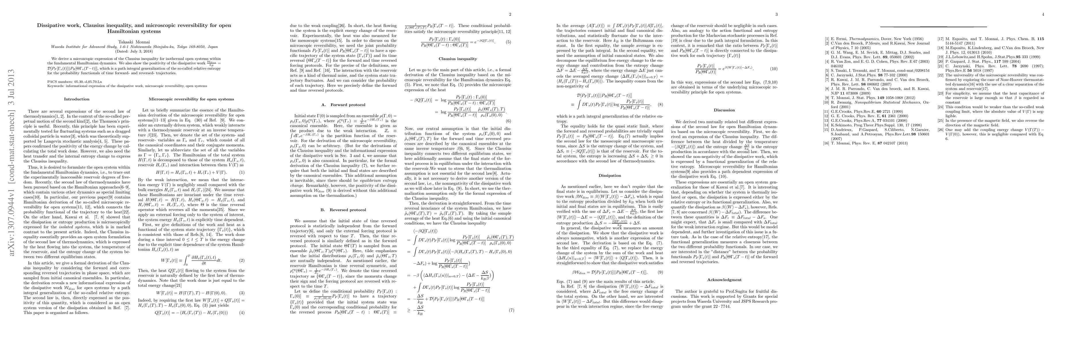 This paper derives a microscopic Clausius inequality for isothermal open Hamiltonian systems and demonstrates the positivity of dissipative work, generalizing relative entropy for probability functionals of forward and reversed time trajectories, while maintaining microscopic reversibility.