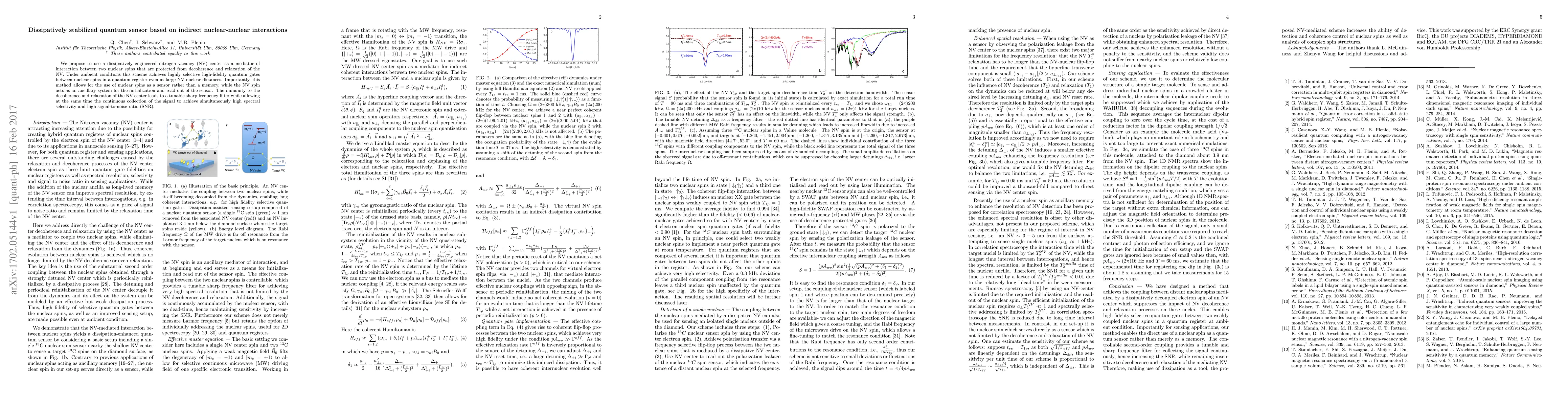 We propose to use a dissipatively engineered nitrogen vacancy (NV) center as a mediator of interaction between two nuclear spins that are protected from decoherence and relaxation of the NV. Under ambient conditions this scheme achieves highly selective high-fidelity quantum gates between nuclear spins in a quantum register even at large NV-nuclear distances. Importantly, this method allows for the use of nuclear spins as a sensor rather than a memory, while the NV spin acts as an ancillary system for the initialization and read out of the sensor. The immunity to the decoherence and relaxation of the NV center leads to a tunable sharp frequency filter while allowing at the same time the continuous collection of the signal to achieve simultaneously high spectral selectivity and high signal-to-noise ratio (SNR).