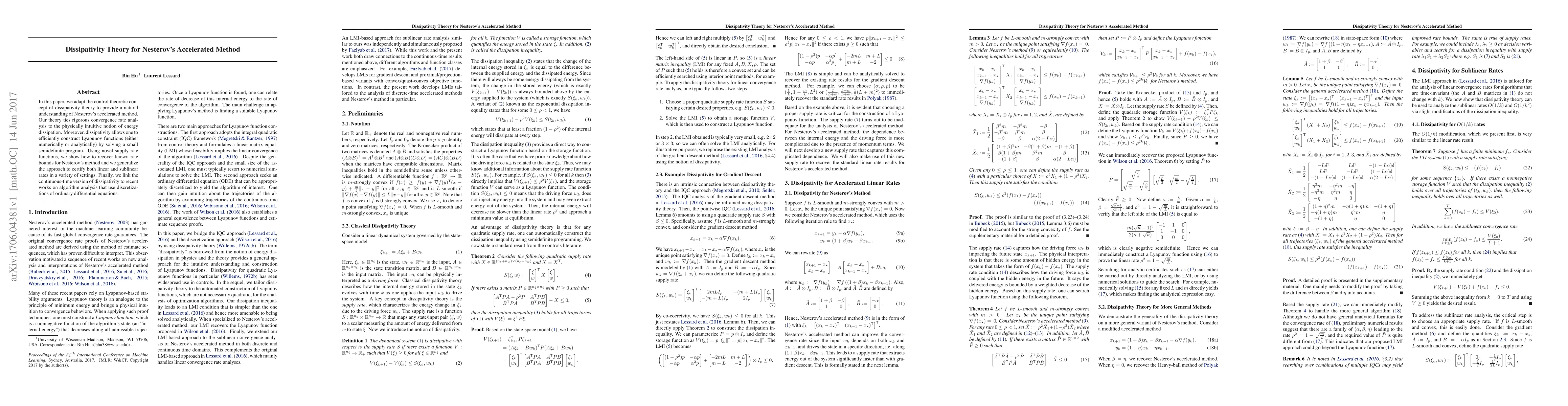 This paper applies dissipativity theory from control theory to Nesterov's accelerated method, linking rigorous convergence analysis to energy dissipation concepts. It constructs Lyapunov functions via semidefinite programming and generalizes convergence rates, connecting continuous-time dissipativity to recent algorithm analysis methods.