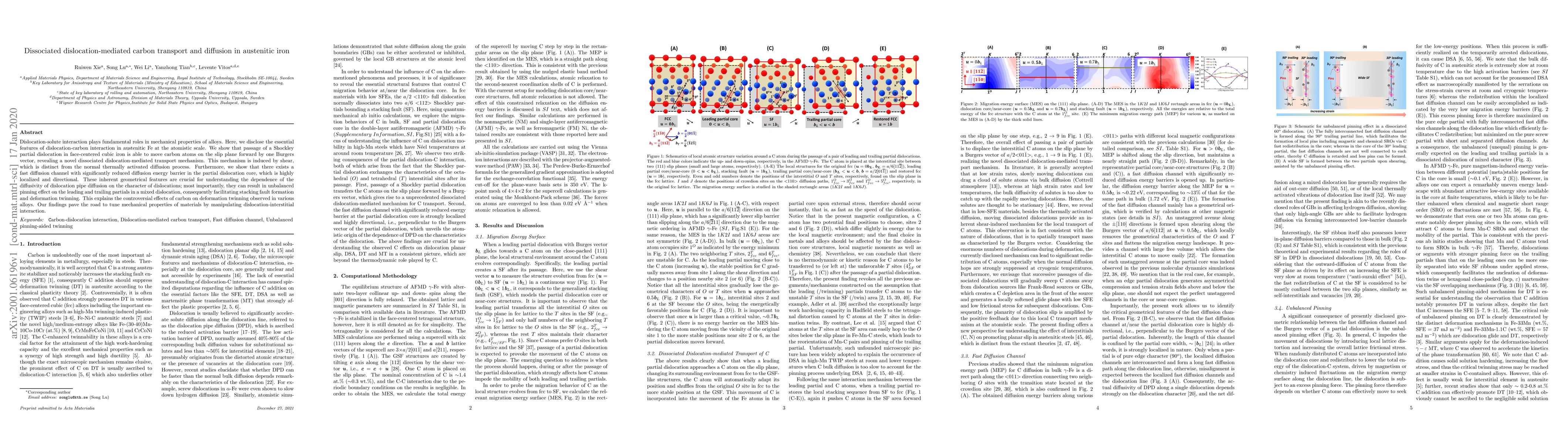 This research uncovers a novel dislocation-mediated carbon transport mechanism in austenitic iron, where passage of a Shockley partial dislocation moves carbon atoms along the slip plane, distinct from typical diffusion. It also reveals a fast diffusion channel in the dislocation core, which impacts the diffusivity and deformation mechanisms, explaining carbon's controversial effects on deformation twinning.