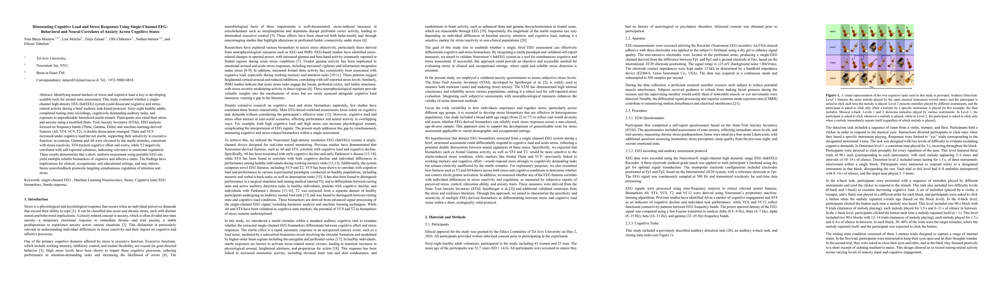 Identifying neural markers of stress and cognitive load is key to developing scalable tools for mental state assessment. This study evaluated whether a single-channel high-density EEG (hdrEEG) system could dissociate cognitive and stress-related activity during a brief auditory task-based protocol. Sixty-eight healthy adults completed resting state recordings, cognitively demanding auditory tasks, and exposure to unpredictable literalized startle stimuli. Participants also rated their stress and anxiety using a modified State-Trait Anxiety Inventory (STAI). EEG analysis focused on frequency bands (Theta, Gamma, Delta) and machine-learning-derived features (A0, ST4, VC9, T2). A double dissociation emerged: Theta and VC9 increased under cognitive load but not startle, supporting their sensitivity to executive function. In contrast, Gamma and A0 were elevated by the startle stimulus, consistent with stress reactivity. ST4 tracked cognitive effort and worry, while T2 negatively correlated with self-reported calmness, indicating relevance to emotional regulation. These results demonstrate that a short, uniform assessment using portable EEG can yield multiple reliable biomarkers of cognitive and affective states. The findings have implications for clinical, occupational, and educational settings, and may inform future neurofeedback protocols targeting simultaneous regulation of attention and stress.