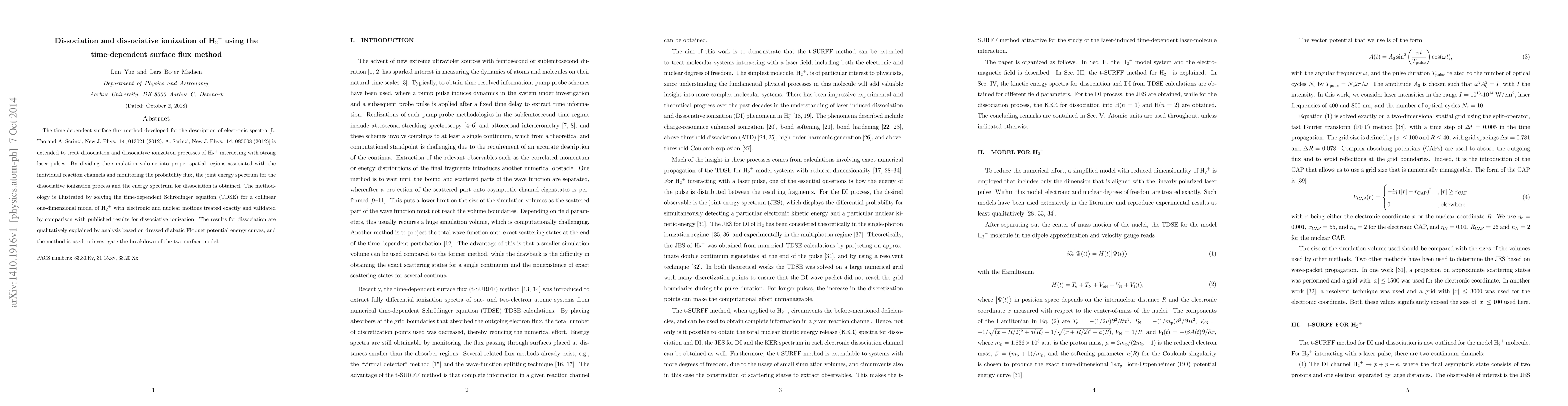 The time-dependent surface flux method developed for the description of electronic spectra [L. Tao and A. Scrinzi, New J. Phys. 14, 013021 (2012); A. Scrinzi, New J. Phys. 14, 085008 (2012)] is extended to treat dissociation and dissociative ionization processes of H2+ interacting with strong laser pulses. By dividing the simulation volume into proper spatial regions associated with the individual reaction channels and monitoring the probability flux, the joint energy spectrum for the dissociative ionization process and the energy spectrum for dissociation is obtained. The methodology is illustrated by solving the time-dependent Schr\"{o}dinger equation (TDSE) for a collinear one-dimensional model of H2+ with electronic and nuclear motions treated exactly and validated by comparison with published results for dissociative ionization. The results for dissociation are qualitatively explained by analysis based on dressed diabatic Floquet potential energy curves, and the method is used to investigate the breakdown of the two-surface model.