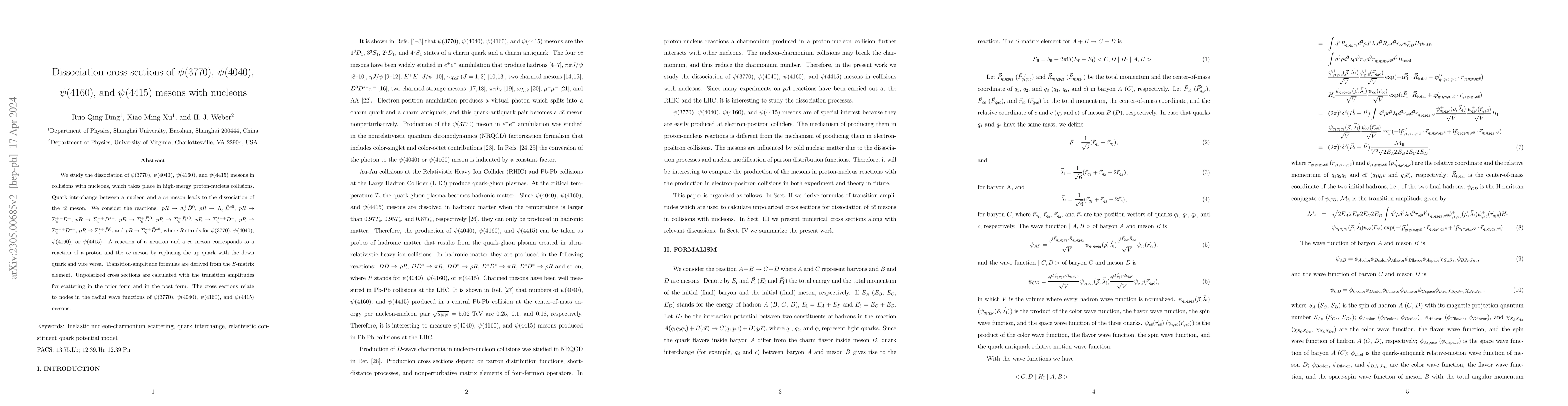 We study the dissociation of $\psi (3770)$, $\psi (4040)$, $\psi (4160)$, and $\psi (4415)$ mesons in collisions with nucleons, which takes place in high-energy proton-nucleus collisions. Quark interchange between a nucleon and a $c\bar c$ meson leads to the dissociation of the $c\bar c$ meson. We consider the reactions: $pR \to \Lambda_c^+ \bar{D}^0$, $pR \to \Lambda_c^+ \bar{D}^{*0}$, $pR \to \Sigma_c^{++} D^-$, $pR \to \Sigma_c^{++} D^{*-}$, $pR \to \Sigma_c^{+} \bar{D}^0$, $pR \to \Sigma_c^{+} \bar{D}^{*0}$, $pR \to \Sigma_c^{*++} D^-$, $pR \to \Sigma_c^{*++} D^{*-}$, $pR \to \Sigma_c^{*+} \bar{D}^0$, and $pR \to \Sigma_c^{*+} \bar{D}^{*0}$, where $R$ stands for $\psi (3770)$, $\psi (4040)$, $\psi (4160)$, or $\psi (4415)$. A reaction of a neutron and a $c\bar c$ meson corresponds to a reaction of a proton and the $c\bar c$ meson by replacing the up quark with the down quark and vice versa. Transition-amplitude formulas are derived from the $S$-matrix element. Unpolarized cross sections are calculated with the transition amplitudes for scattering in the prior form and in the post form. The cross sections relate to nodes in the radial wave functions of $\psi (3770)$, $\psi (4040)$, $\psi (4160)$, and $\psi (4415)$ mesons.
