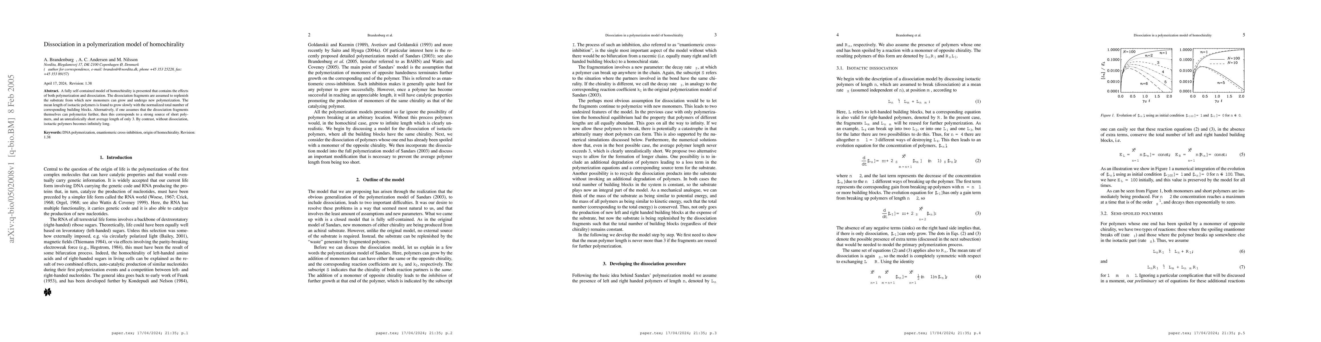 This research introduces a polymerization model incorporating dissociation, affecting homochirality. The model shows that dissociation fragments replenish substrate, allowing new polymer growth. Without dissociation, polymers grow infinitely long; with it, polymer length increases slowly, but dissociation fragments self-polymerizing cause unrealistically short polymers of only 3 units.