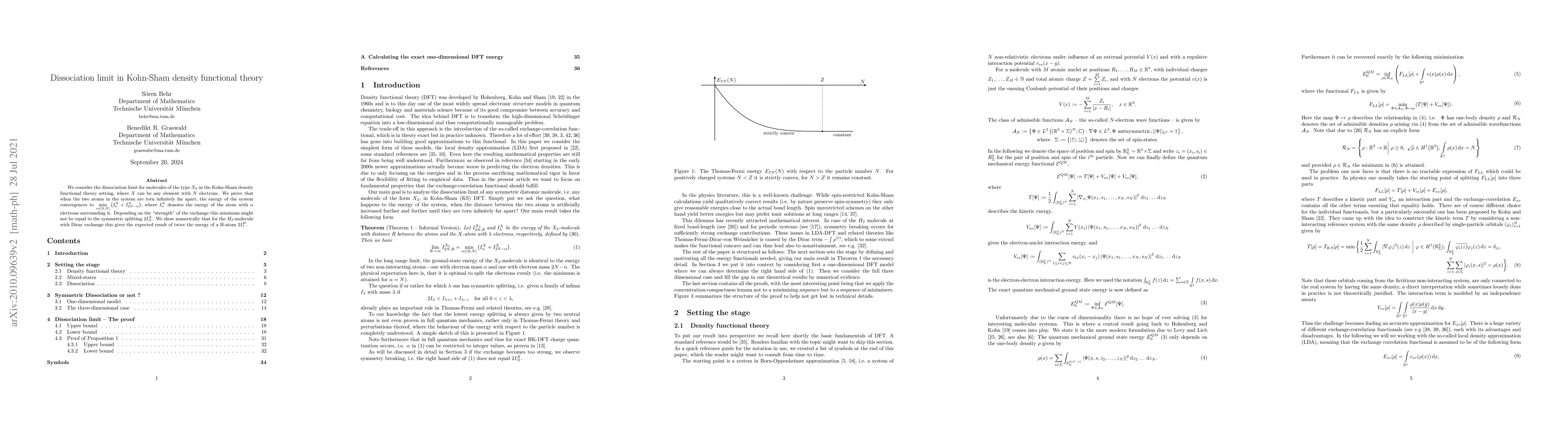 This paper investigates the dissociation limit in Kohn-Sham density functional theory for diatomic molecules $X_2$, showing that as atoms separate infinitely, the energy converges to the minimum of the sum of ionization energies of atoms with different electron counts. Numerical results for $H_2$ with Dirac exchange confirm the expected energy of twice the hydrogen atom's ionization energy.