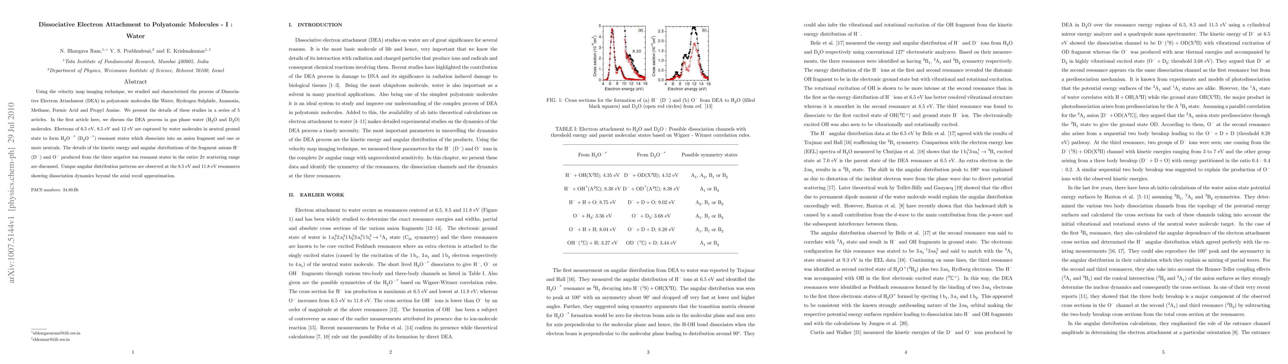 Using the velocity map imaging technique, we studied and characterized the process of Dissociative Electron Attachment (DEA) in polyatomic molecules like Water, Hydrogen Sulphide, Ammonia, Methane, Formic Acid and Propyl Amine. We present the details of these studies in a series of 5 articles. In the first article here, we discuss the DEA process in gas phase water ($H_{2}O$ and $D_{2}O$) molecules. Electrons of 6.5 eV, 8.5 eV and 12 eV are captured by water molecules in neutral ground state to form $H_{2}O^{-*}$ ($D_{2}O^{-*}$) resonant states which dissociate into an anion fragment and one or more neutrals. Kinetic energy and angular distributions of the fragment anions $H^{-}$($D^{-}$) and $O^{-}$ produced from the three negative ion resonant states in the entire $2\pi$ scattering range are obtained. Unique angular distribution patterns are observed at the 8.5 eV and 11.8 eV resonances showing dissociation dynamics beyond the axial recoil approximation.