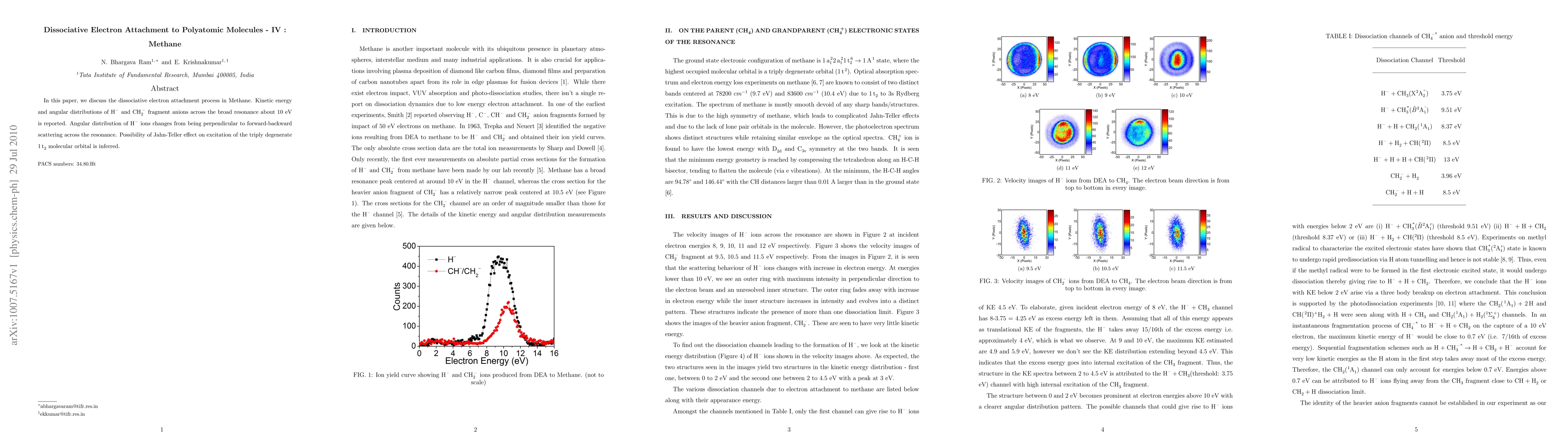 This paper investigates dissociative electron attachment in methane, reporting kinetic and angular distributions of H^{-} and CH_{2}^{-} anions around a resonance near 10 eV. The angular distribution of H^{-} shifts from perpendicular to forward-backward scattering across the resonance, suggesting a possible Jahn-Teller effect on the 1t2 molecular orbital excitation.