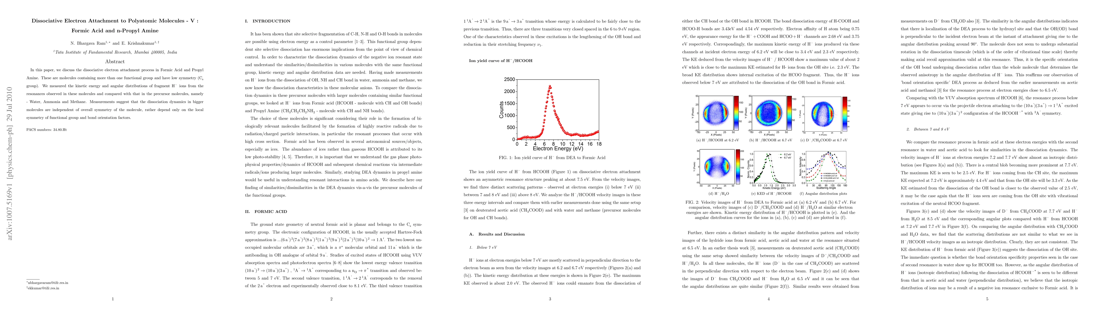 This study investigates dissociative electron attachment in Formic Acid and Propyl Amine, observing kinetic energy and angular distributions of fragment H^{-} ions. Results indicate that dissociation dynamics depend on local functional group symmetry rather than overall molecular symmetry.