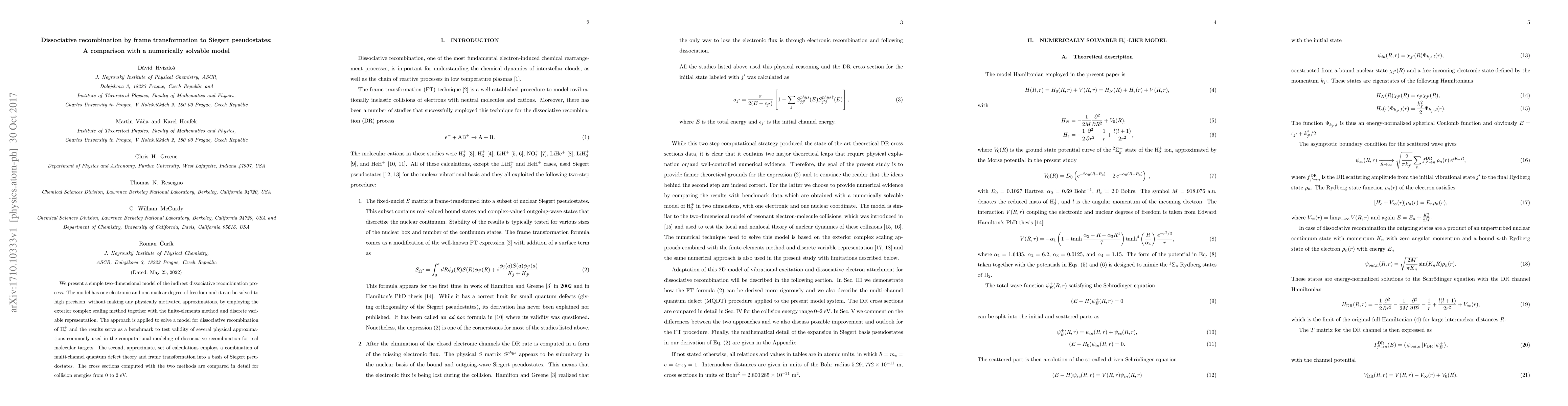 We present a simple two-dimensional model of the indirect dissociative recombination process. The model has one electronic and one nuclear degree of freedom and it can be solved to high precision, without making any physically motivated approximations, by employing the exterior complex scaling method together with the finite-elements method and discrete variable representation. The approach is applied to solve a model for dissociative recombination of H$_2^+$ and the results serve as a benchmark to test validity of several physical approximations commonly used in the computational modeling of dissociative recombination for real molecular targets. The second, approximate, set of calculations employs a combination of multi-channel quantum defect theory and frame transformation into a basis of Siegert pseudostates. The cross sections computed with the two methods are compared in detail for collision energies from 0 to 2 eV.