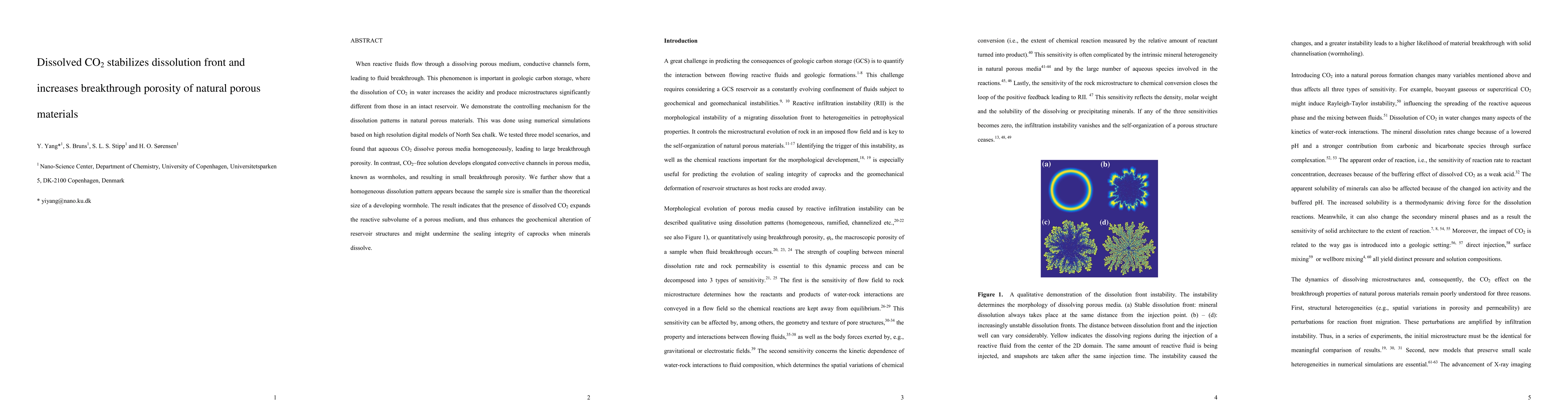 This study reveals that dissolved CO2 in water leads to homogeneous dissolution and increased breakthrough porosity in natural porous materials, contrasting with CO2-free solutions that form wormholes and lower breakthrough porosity. The findings suggest that dissolved CO2 enhances geochemical changes in reservoir structures, potentially compromising caprock integrity.