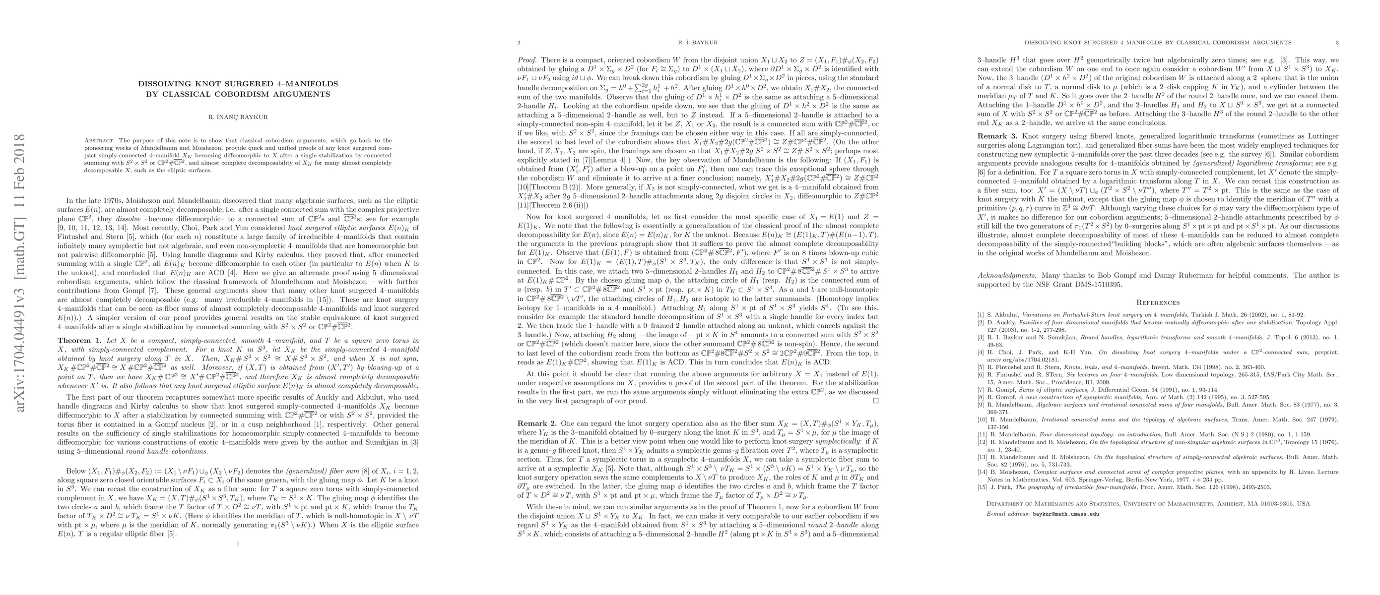 This paper uses classical cobordism arguments to prove that knot-surgered 4-manifolds can be diffeomorphic to their original form after a single stabilization, providing a unified proof for many compact simply-connected manifolds.