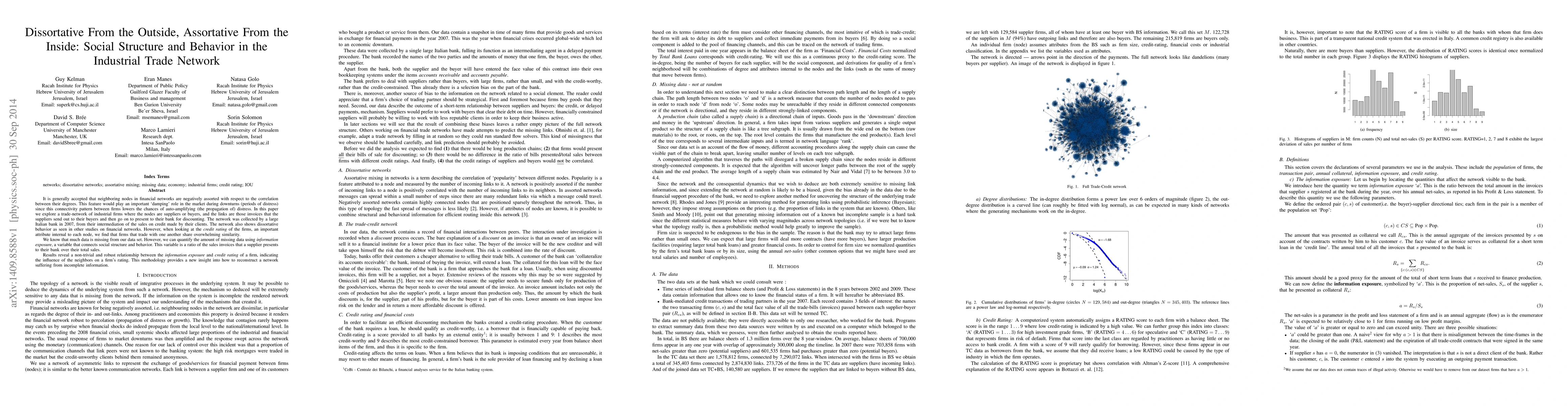 It is generally accepted that neighboring nodes in financial networks are negatively assorted with respect to the correlation between their degrees. This feature would play an important 'damping' role in the market during downturns (periods of distress) since this connectivity pattern between firms lowers the chances of auto-amplifying (the propagation of) distress. In this paper we explore a trade-network of industrial firms where the nodes are suppliers or buyers, and the links are those invoices that the suppliers send out to their buyers and then go on to present to their bank for discounting. The network was collected by a large Italian bank in 2007, from their intermediation of the sales on credit made by their clients. The network also shows dissortative behavior as seen in other studies on financial networks. However, when looking at the credit rating of the firms, an important attribute internal to each node, we find that firms that trade with one another share overwhelming similarity. We know that much data is missing from our data set. However, we can quantify the amount of missing data using information exposure, a variable that connects social structure and behavior. This variable is a ratio of the sales invoices that a supplier presents to their bank over their total sales. Results reveal a non-trivial and robust relationship between the information exposure and credit rating of a firm, indicating the influence of the neighbors on a firm's rating. This methodology provides a new insight into how to reconstruct a network suffering from incomplete information.